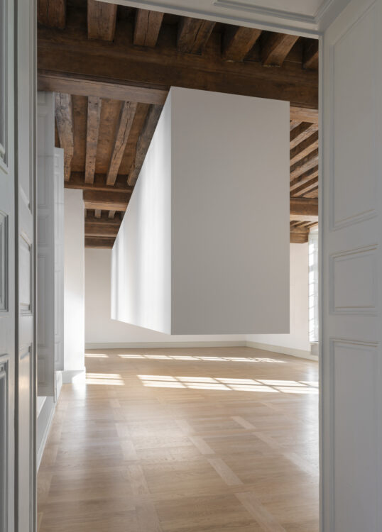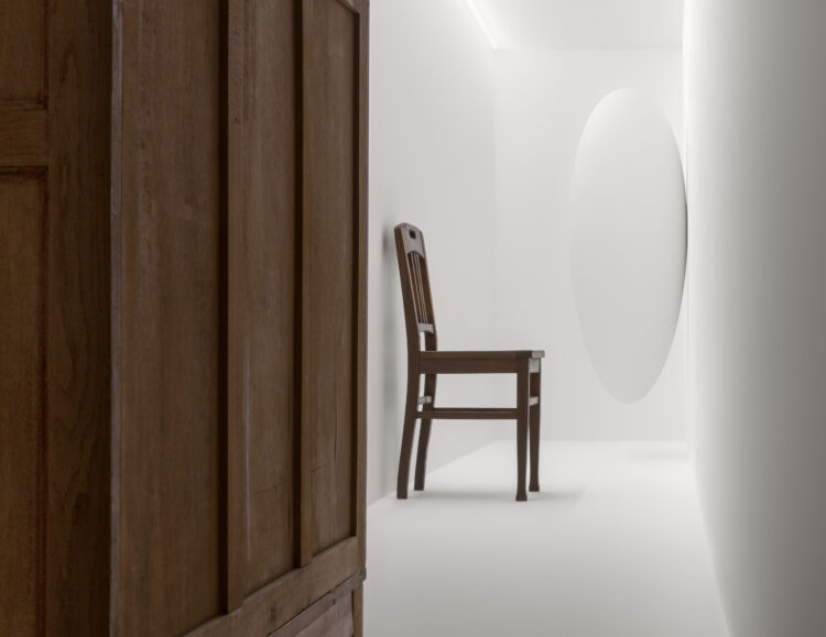 En entrant dans la seconde salle, la surprise est totale : une vaste structure semble flotter dans l’espace. D’un blanc immaculé et de forme rectangulaire, elle s’étire sur toute la longueur de la salle d’exposition. En marchant autour de ce bloc, on découvre, de l’autre côté, une ouverture qui révèle une large pièce aménagée en son intérieur. Étrangement agencée, elle accueille quelques meubles qui détonnent : une armoire et une chaise en bois, placées à côté d’une forme ovoïde blanche — motif que l’on retrouve, qui commence peut-être à dévoiler les intentions de l’artiste.