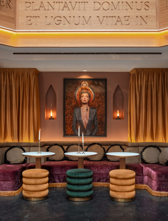 28 chambres invitent à la rêverie et au laisser-aller, tandis qu’un bar sert cocktails malicieux et assiettes à partager sous une coupole vertigineuse. S’y mêle cabaret sensuel, salon de bain confidentiel sous voûtes et muses inspirantes. Tout un programme entre sacré et interdit.