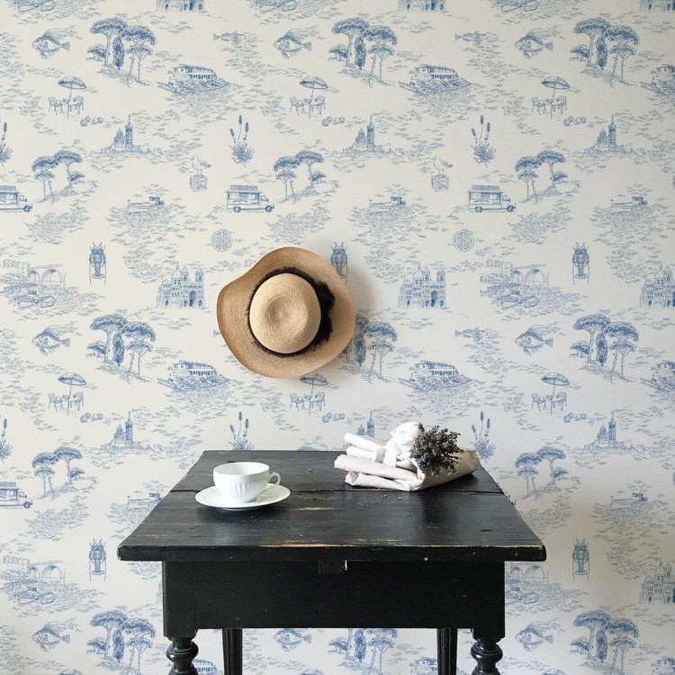 La marque a à coeur de renouer avec la tradition du papier peint dessiné à la main tout en variant les techniques (gouache, feutre, encre…). Chaque modèle de Meynial raconte une histoire, avec ce petit pas de côté propre à Marianne Ratier. A côté des collections permanentes, Meynial peut aussi accompagner ses clients dans leurs projets avec des créations sur-mesure. Meynial se veut une marque éthique et responsable privilégiant les circuits courts : papier made in France, impression écologique sans solvant à Paris, avec une production à la commande. Un de nos coups de cœur : le papier peint Bons Baisers de Marseille qui réinvente délicieusement la toile de Jouy.