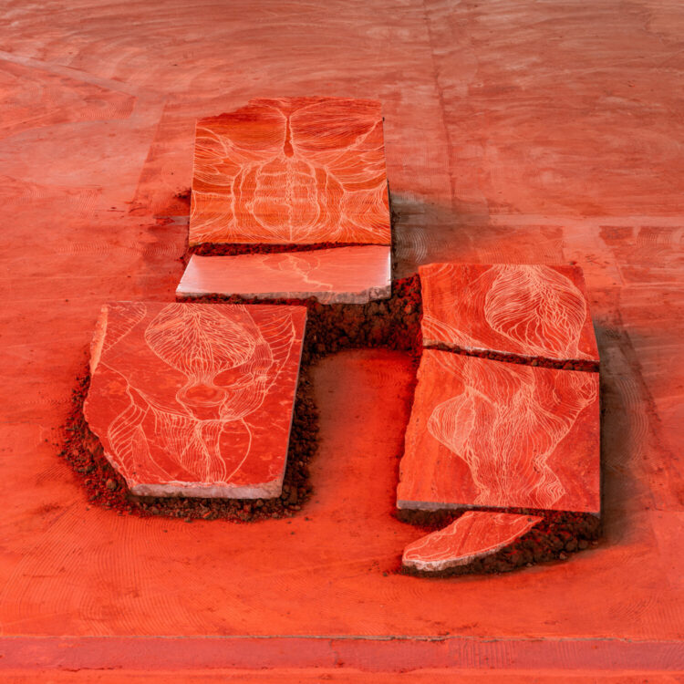 Dans son récit Ma mère rit, l’artiste et cinéaste Chantal Akerman relate un quotidien traversé par la maladie et le délitement amoureux. Lors d’un dîner, elle évoque un souffle d’espoir qui se manifeste par le « besoin de rire au milieu de la catastrophe annoncée. Rire sur un volcan ». C’est de ce cri de joie, à l’aune de funestes présages, qu’est née l’idée de cette exposition. La figure du volcan convoque à la fois l’imaginaire d’un effondrement imminent, une esthétique géologique sensuelle et la fragilité du temps humain. Rire sur un Volcan explore la matérialité des éléments bruts et prend la forme d’un voyage dans les profondeurs des mines, l’intensité d’un champ magnétique, au bord d’un cratère ou au contact d’une météorite.