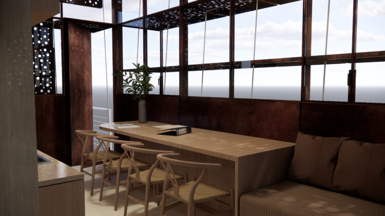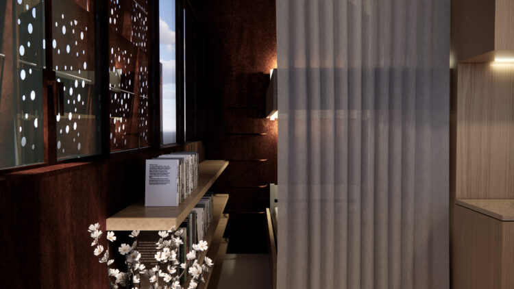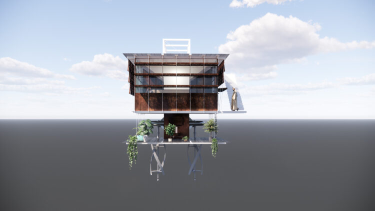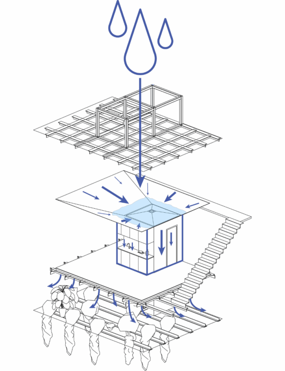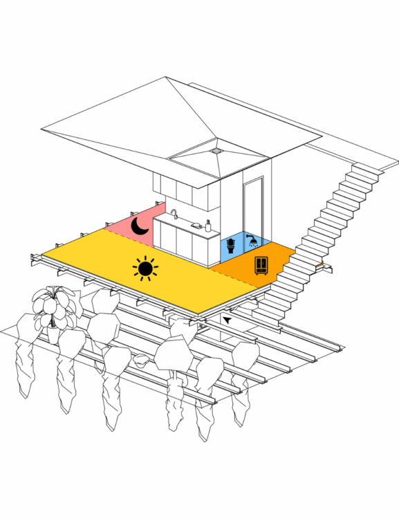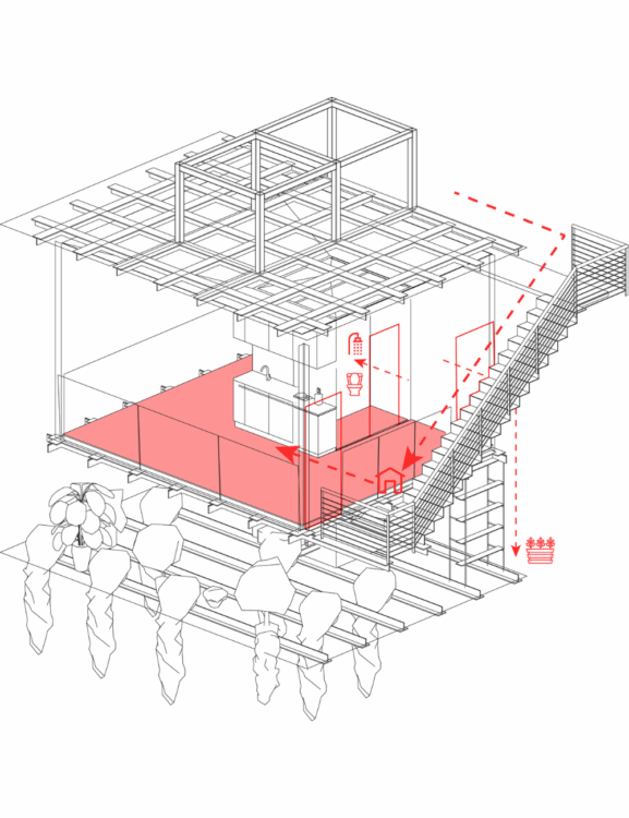 La micro-maison est organisée verticalement pour maximiser l’efficacité spatiale et optimiser les espaces de vie. L’entrée se fait par la terrasse comprenant un potager et un local technique, menant au niveau inférieur à l’abri du bruit et des regards. Les pièces humides (cuisine, salle d’eau et toilettes) sont au centre, la gestion de l’eau devenant le symbole des préoccupations actuelles. Rangements, séjour et chambre se développent autour, profitant des façades vitrées.