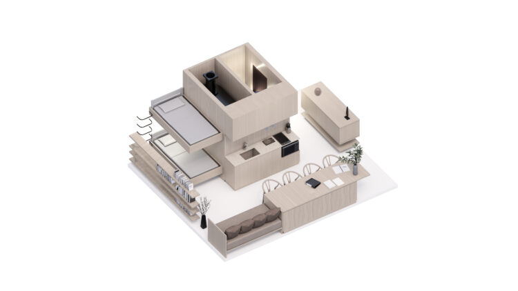 L’idée du projet de l’agence parisienne et grenobloise A’IDA, est un module d’habitation réversible et transportable à maintes reprises en fonction de l’évolution des besoins.