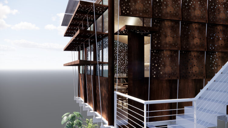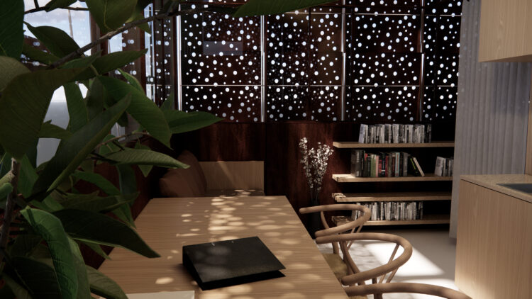 La perforation des panneaux en façade laisse rentrer la lumière et offre un décor mouvant au fil de la journée.
