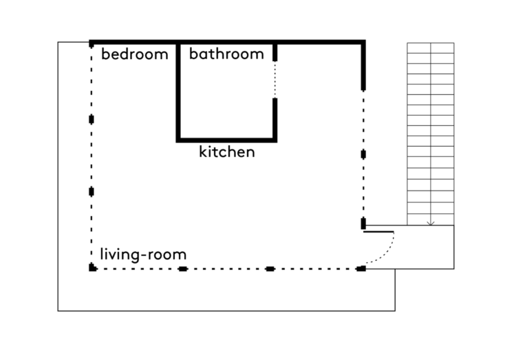 L’espace nuit est isolé de la pièce de vie à l’aide d’un rideau. Aucune cloison ou porte n’est prévue afin de conserver une circulation fluide entre les différentes zones et un maximum de modularité.