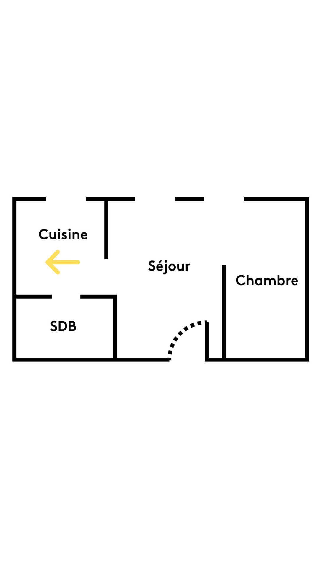 Vue depuis l’entrée de la chambre. Direction la cuisine, délimitée par un îlot qui sert aussi de bar et de table à manger.
