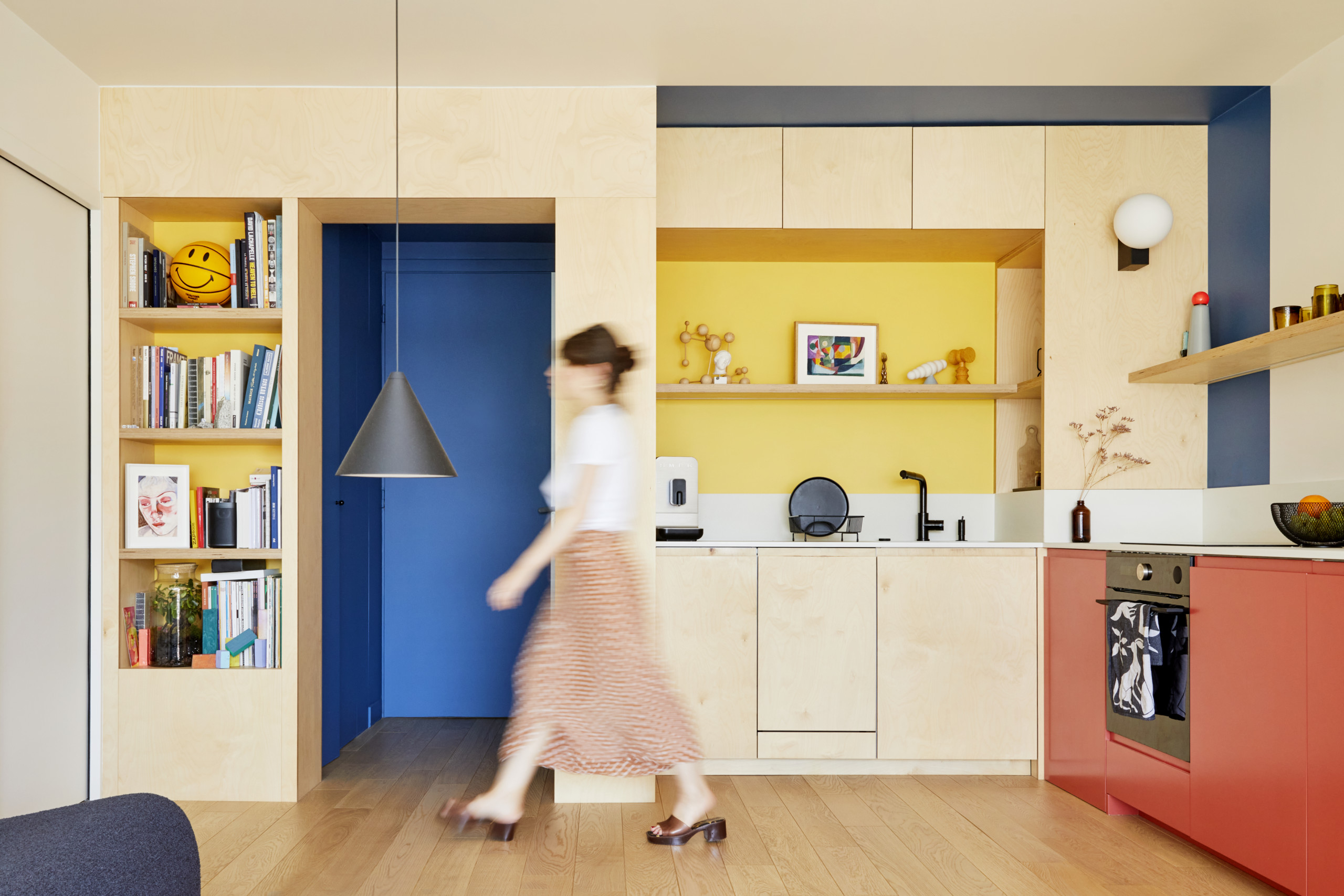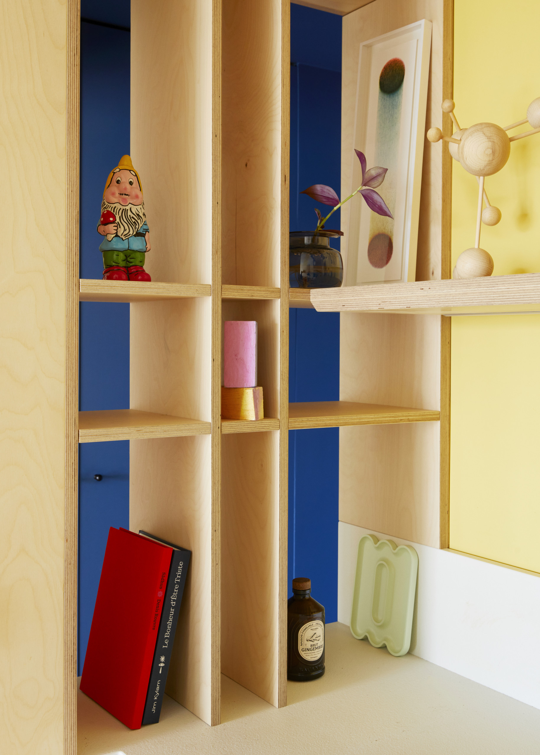 Car ce ne sont pas les rangements qui manquent ! Le contreplaqué crée une structure qui englobe autant des placards fermés qu’une bibliothèque.