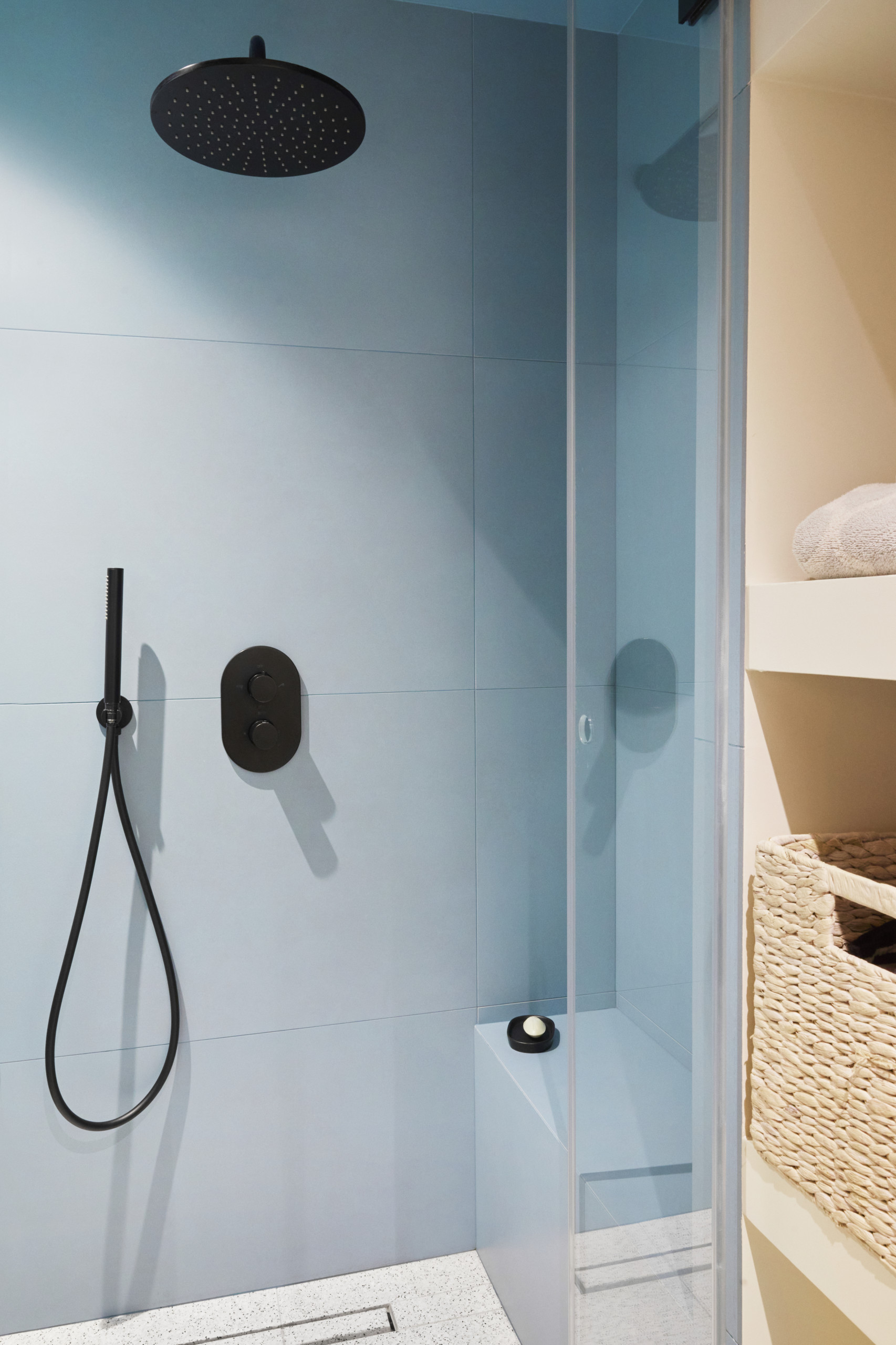 Avec un ton pastel et son petit banc intégré, la douche invite à faire une pause et prendre du temps pour soi !