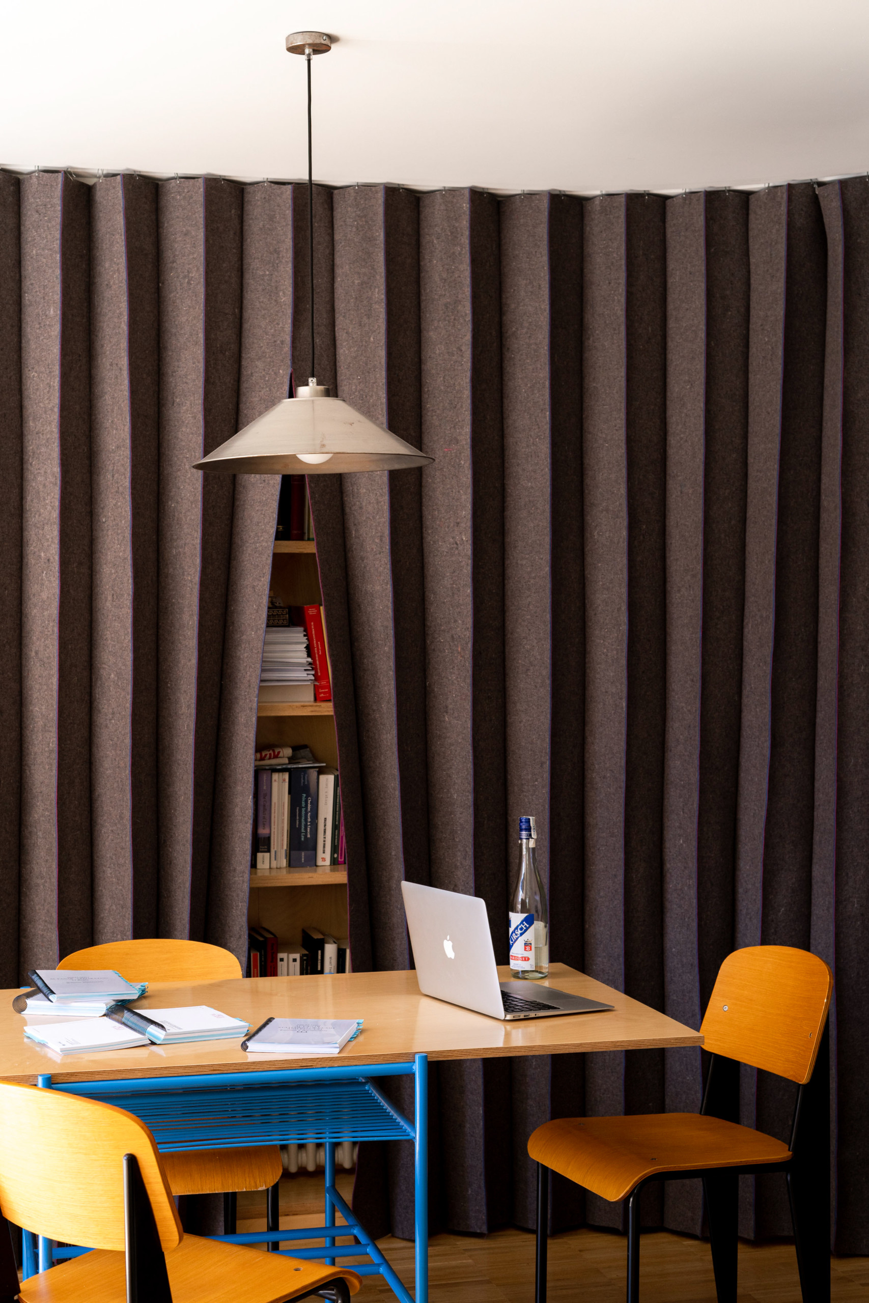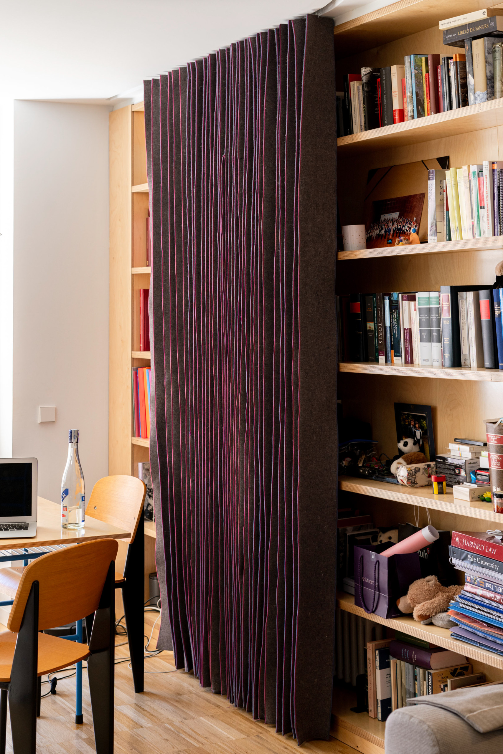 Lorsqu’il n’est pas déployé, le rideau révèle une bibliothèque installée dans le prolongement du canapé et de l’espace salon.