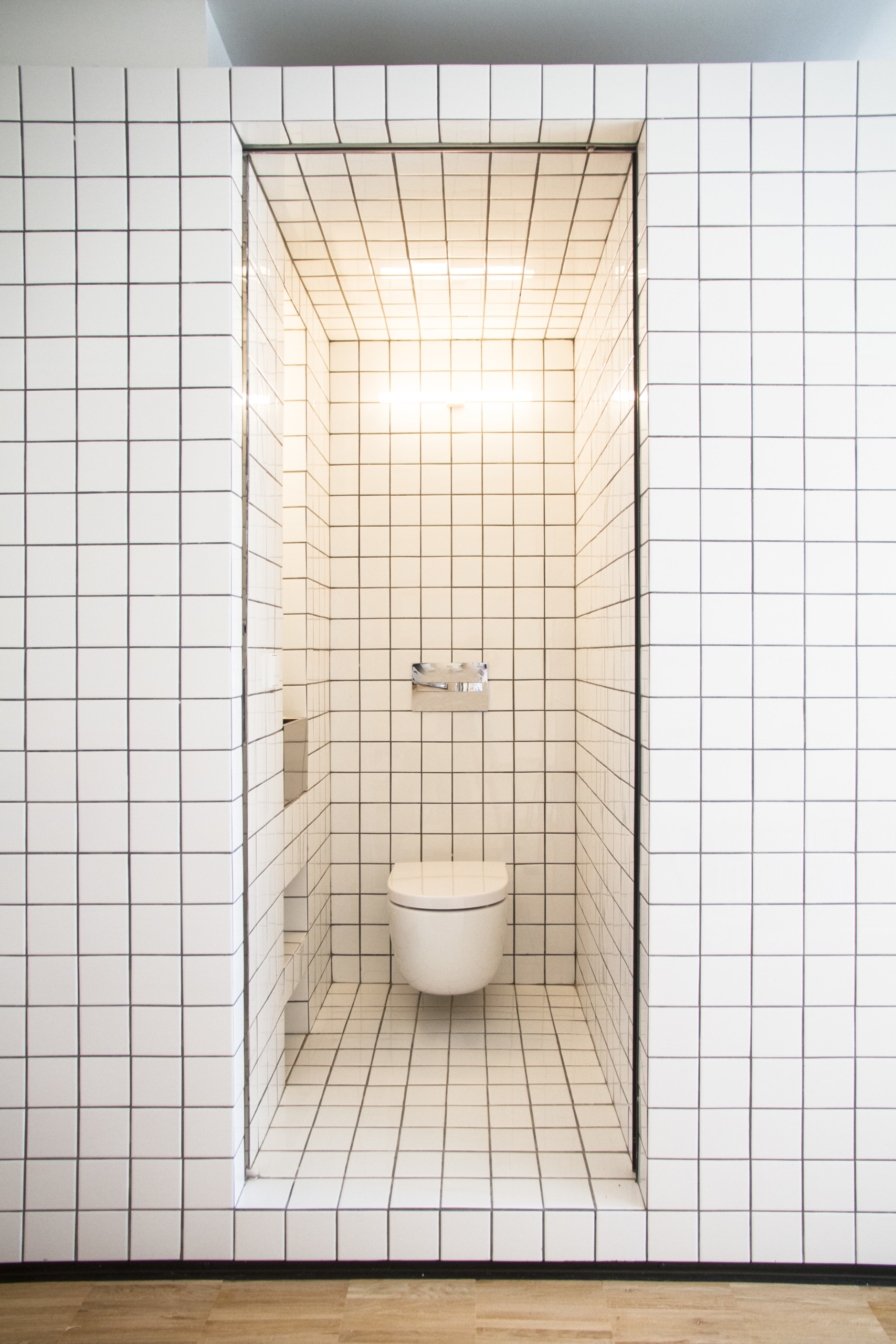 L’entrée se fait juste à droite de ce module entièrement recouvert de carreaux blancs 10 x 10. Il est installé au centre de la pièce unique de 40 m² et regroupe l’ensemble des équipements techniques.