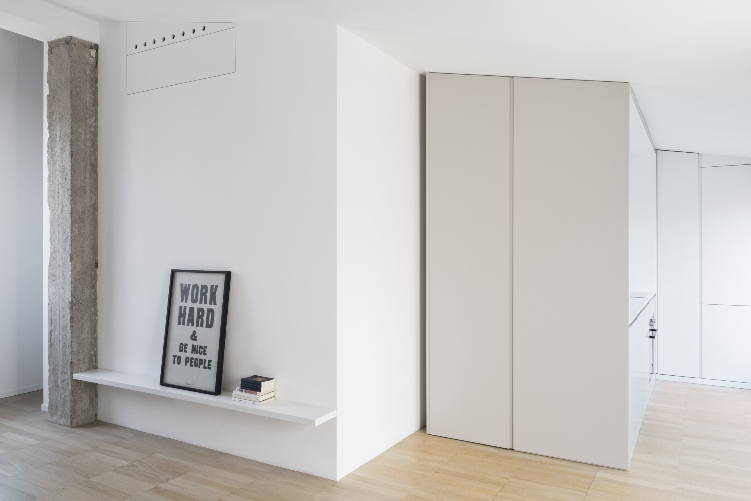 La cuisine se prolonge en couloir le long du mur. Intégralement blanche et encastrée dans un module, elle donne un effet de pureté qui contraste avec la structure de béton laissée apparente.