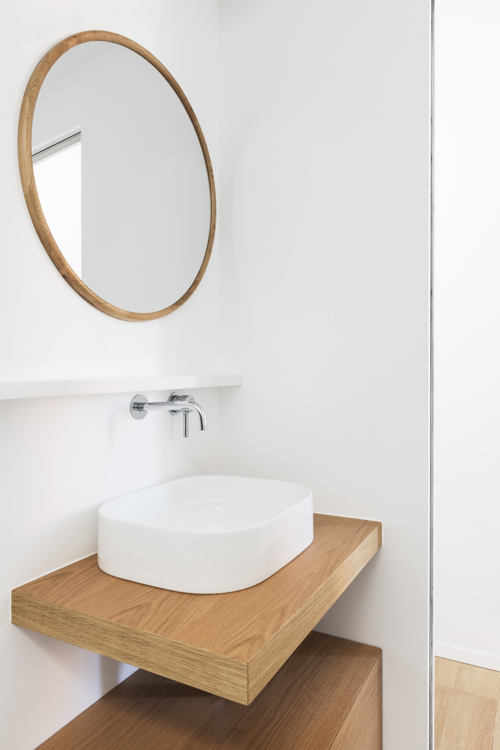 Le bois et le blanc restent le fil conducteur dans la salle d’eau, sobre et bienfaisante.