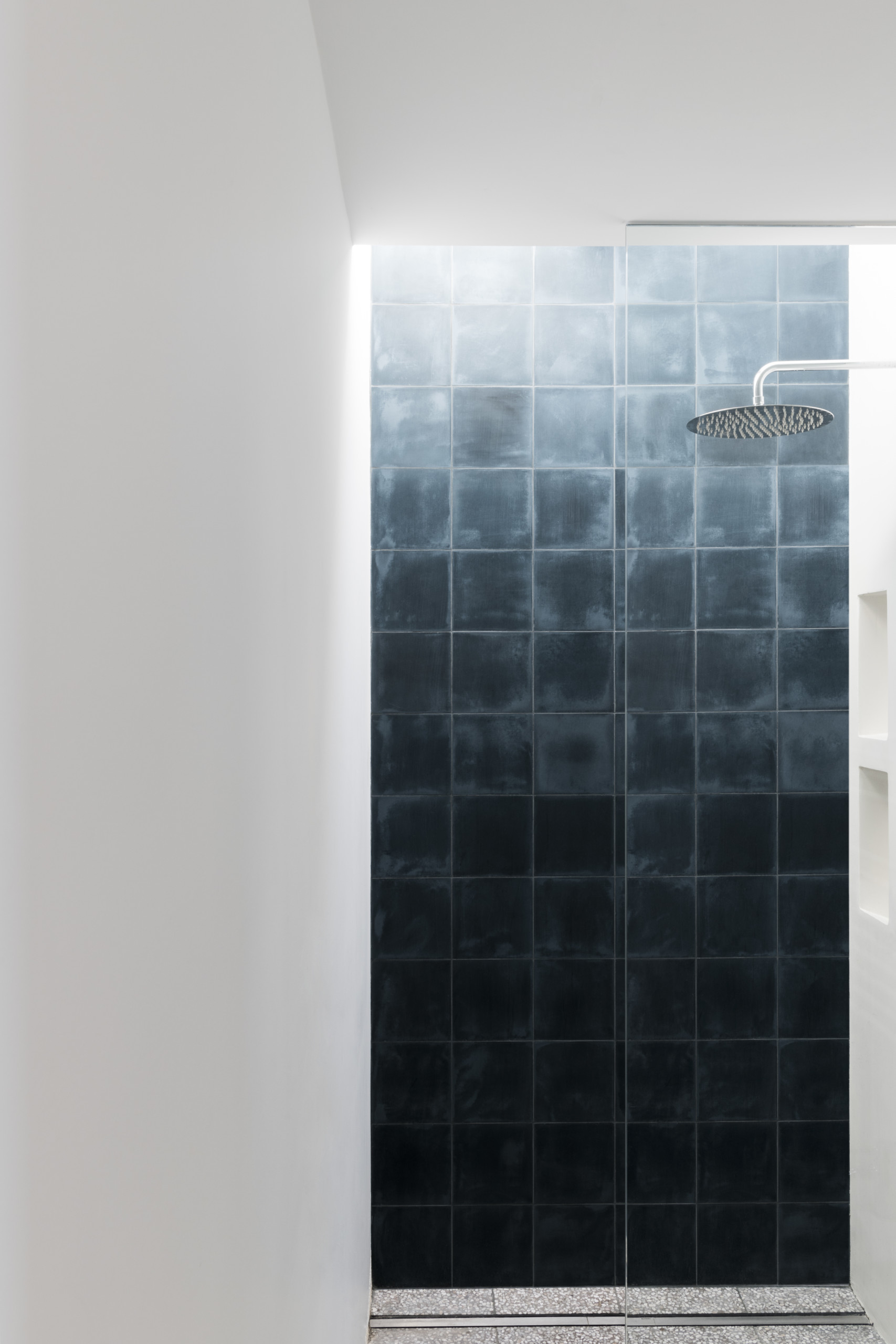 La douche à l’italienne garde une inspiration brute avec ses carreaux de ciment et son terrazzo au sol. Une ouverture zénithale a été créée pour bénéficier de l’éclairage naturel direct dans chaque pièce.