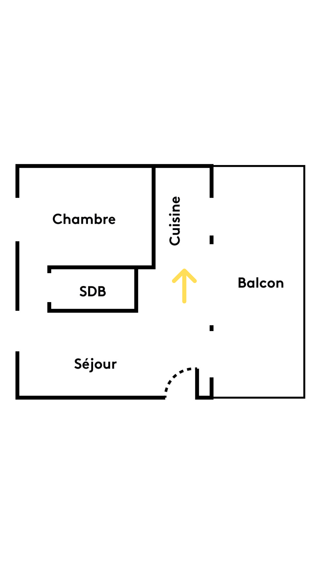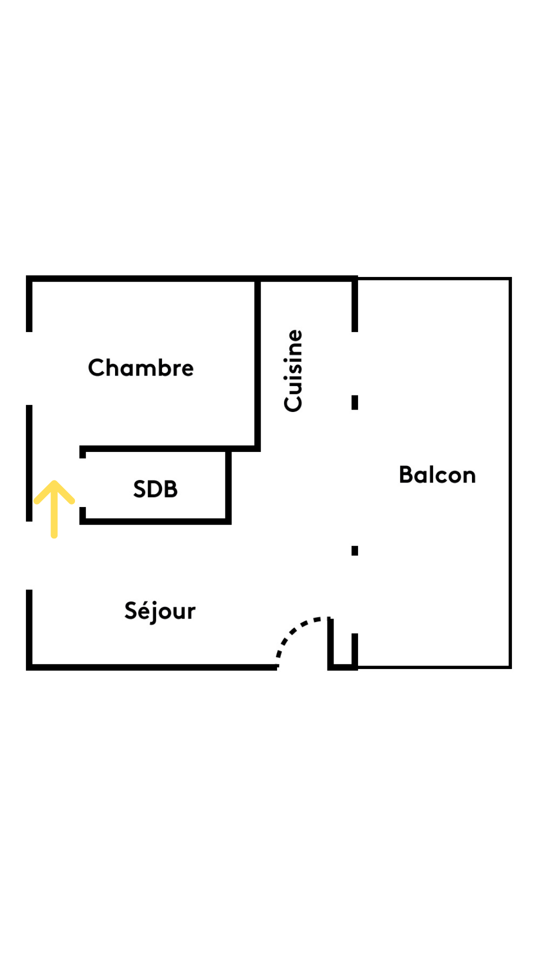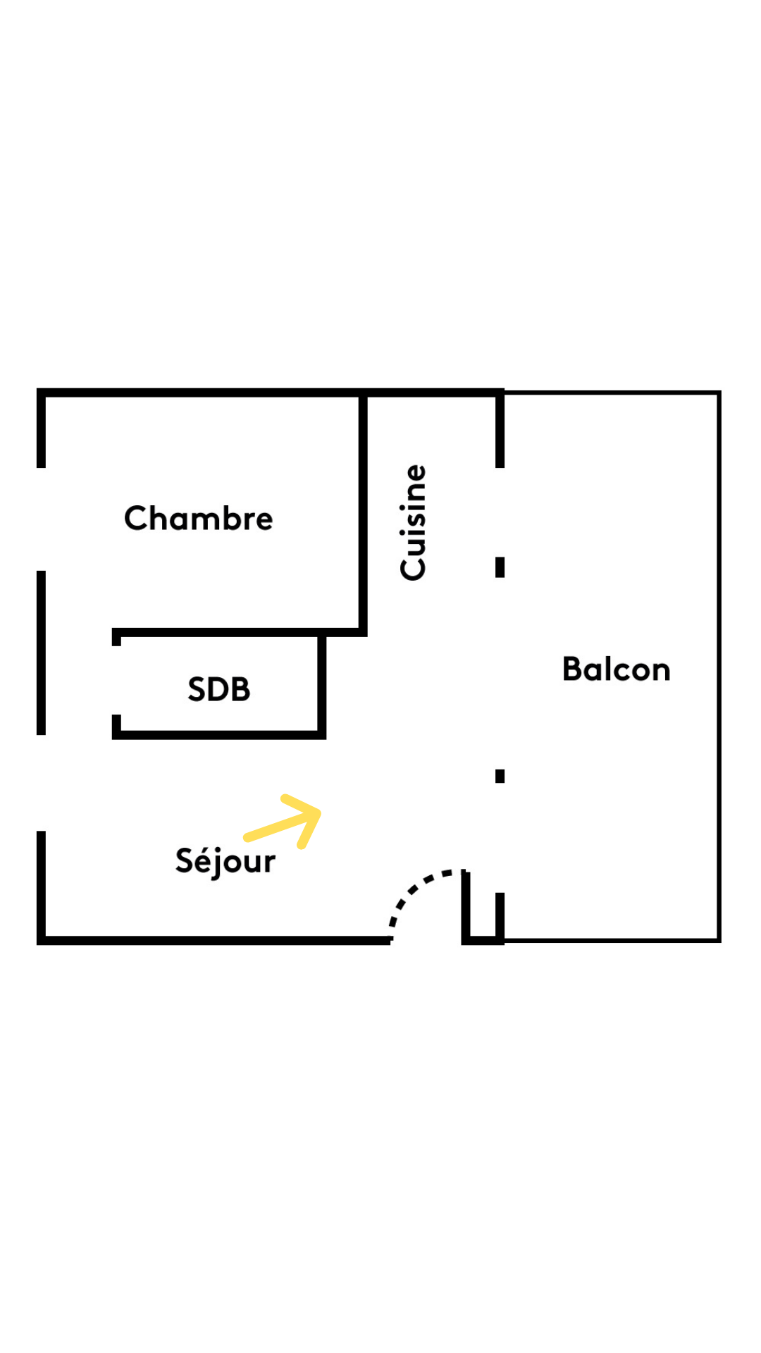 Vue d’ensemble du séjour et de ses volumes. L’angle formé par les deux cloisons renferme la salle d’eau. Pour y accéder, il suffit d’emprunter le petit passage délimité par la poutre en béton.