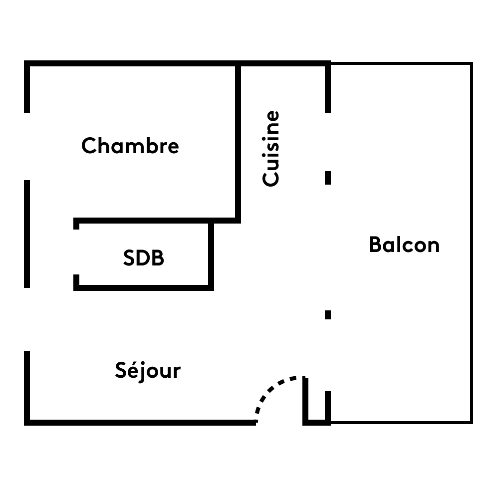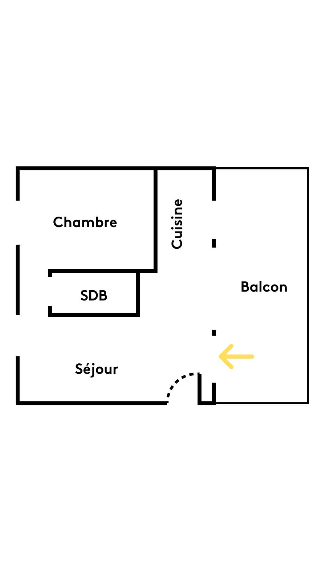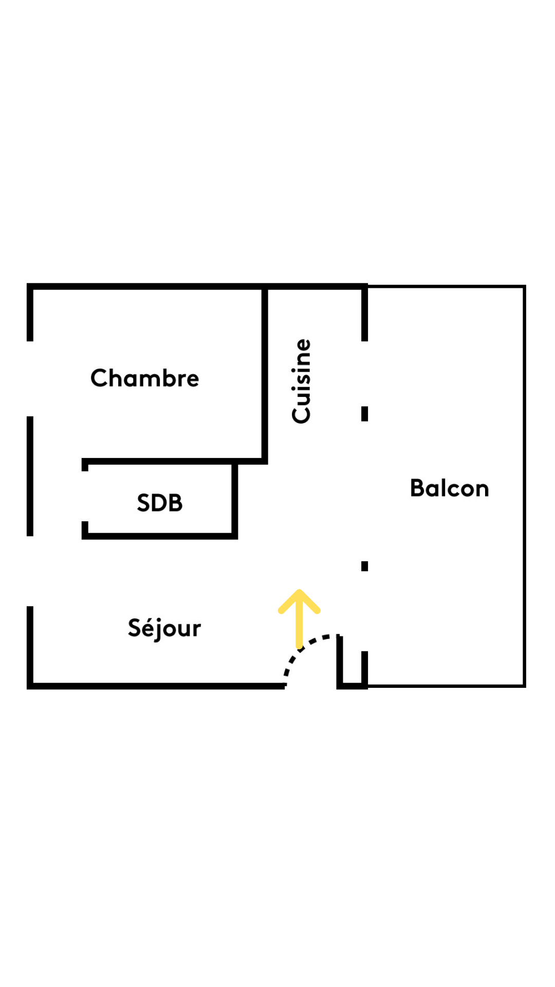 Vue d’ensemble du séjour et de ses volumes. L’angle formé par les deux cloisons renferme la salle d’eau. Pour y accéder, il suffit d’emprunter le petit passage délimité par la poutre en béton.