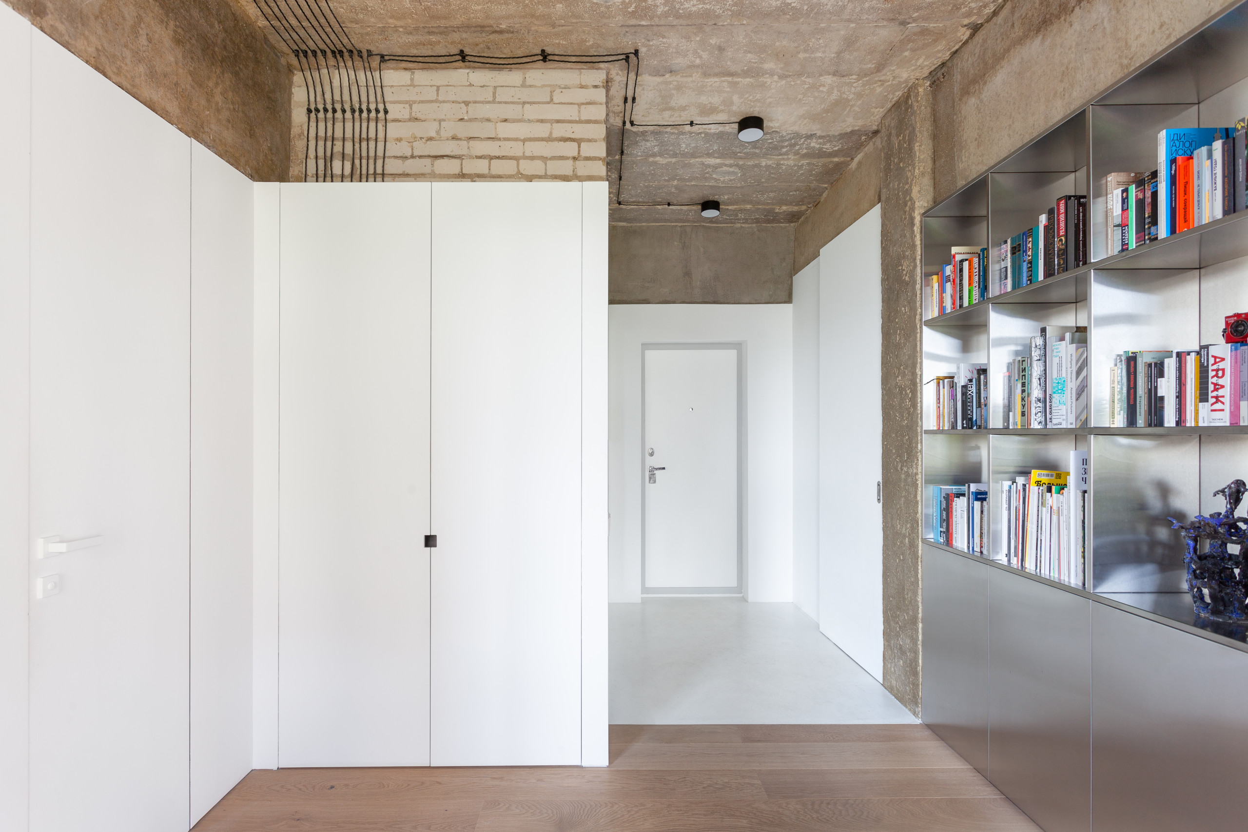 Dès l’entrée, l’effet est assuré ! Plafond en béton brut, haut des murs en briques d’origines apparentes. L’habillage des murs est assuré par des aplats de blanc, des modules de rangements et une bibliothèque.