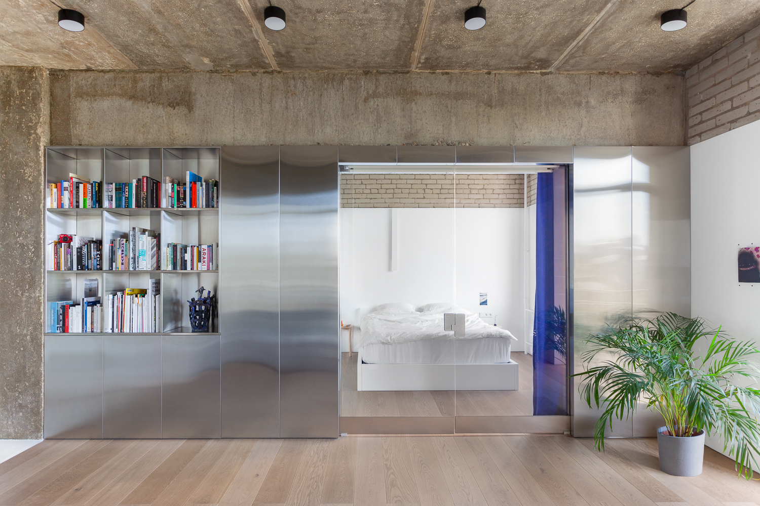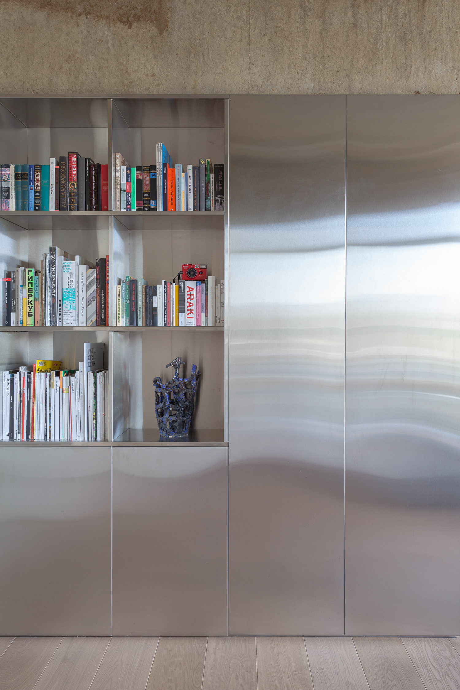 Gros plan sur la bibliothèque réalisée sur-mesure en aluminium brossé. Sa finition reflète la lumière et contraste avec le parquet au sol.