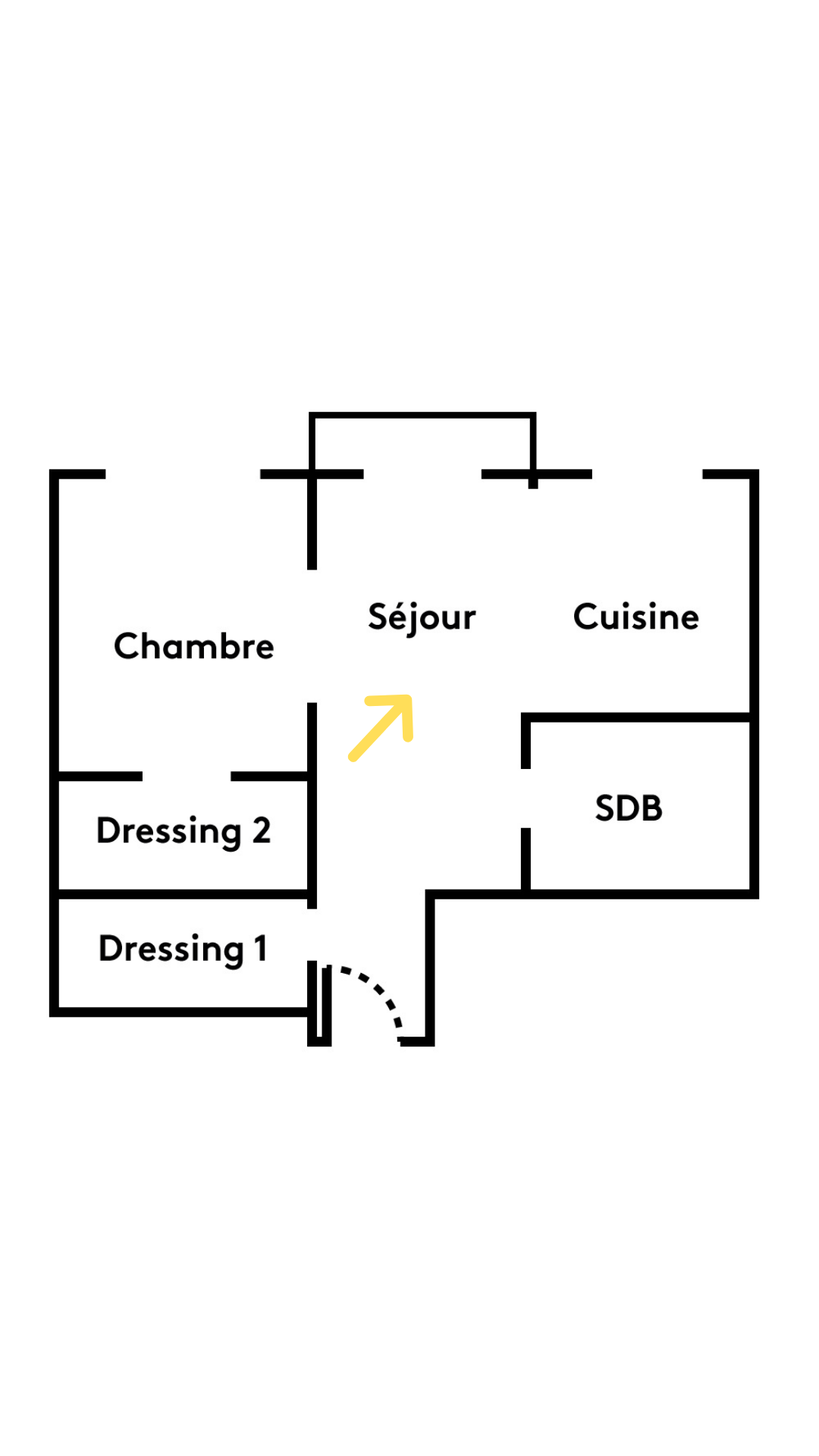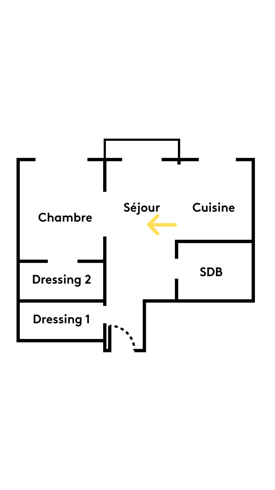 Vue d’ensemble sur le séjour. Comme dans l’entrée, les murs n’ont pas été peints jusqu’au plafond, accentuant ainsi la déjà très belle sensation de hauteur.