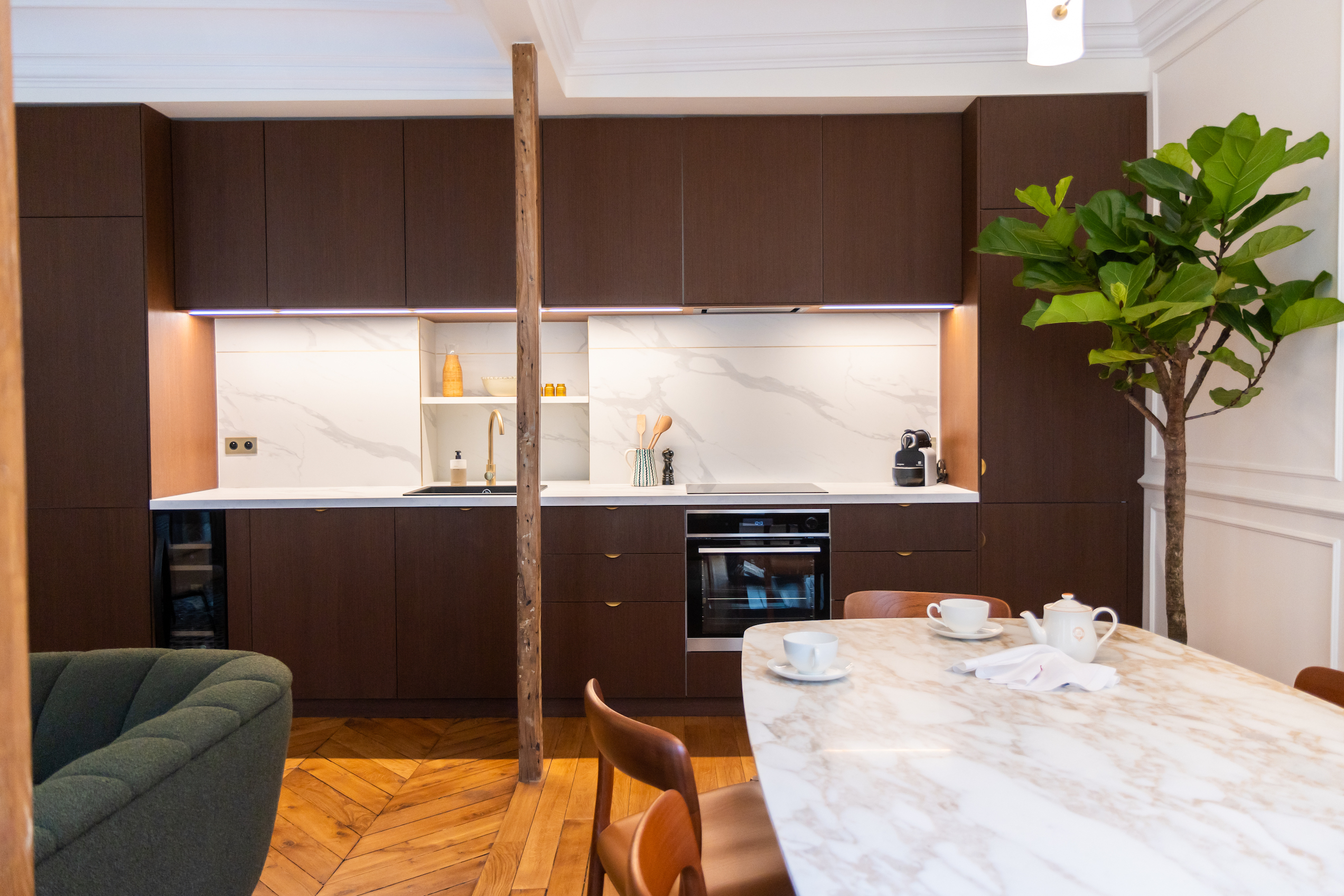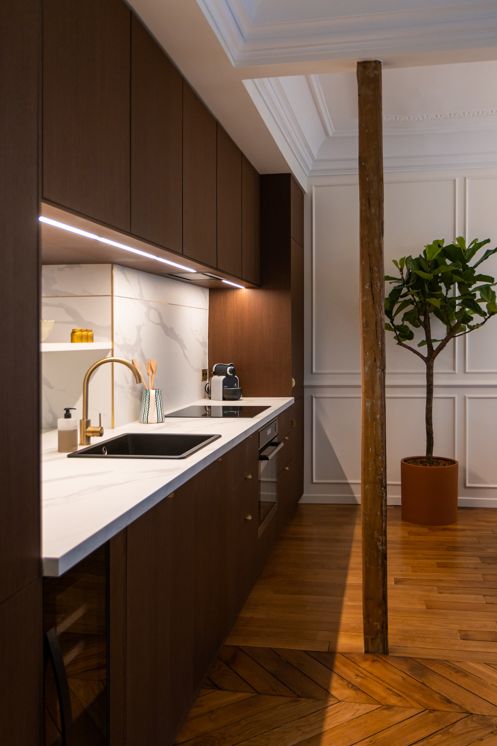 Les façades en noyer soulignent l’élégance du plan de travail et de la crédence en céramique, tandis que des touches de laiton éveillent l’ensemble.