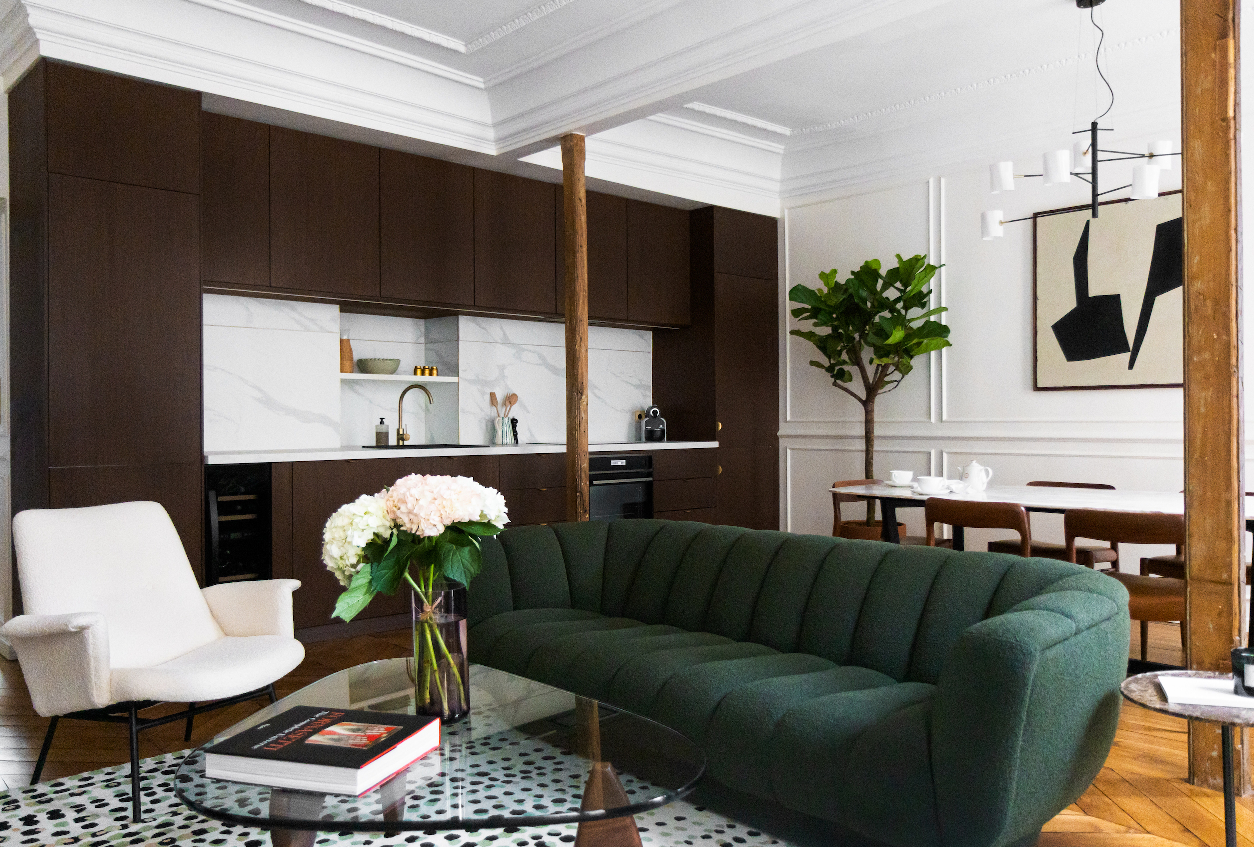 Conservés pour des raisons structurelles, les deux poteaux porteurs témoignent de l’histoire de cet appartement magnifiquement rénové !