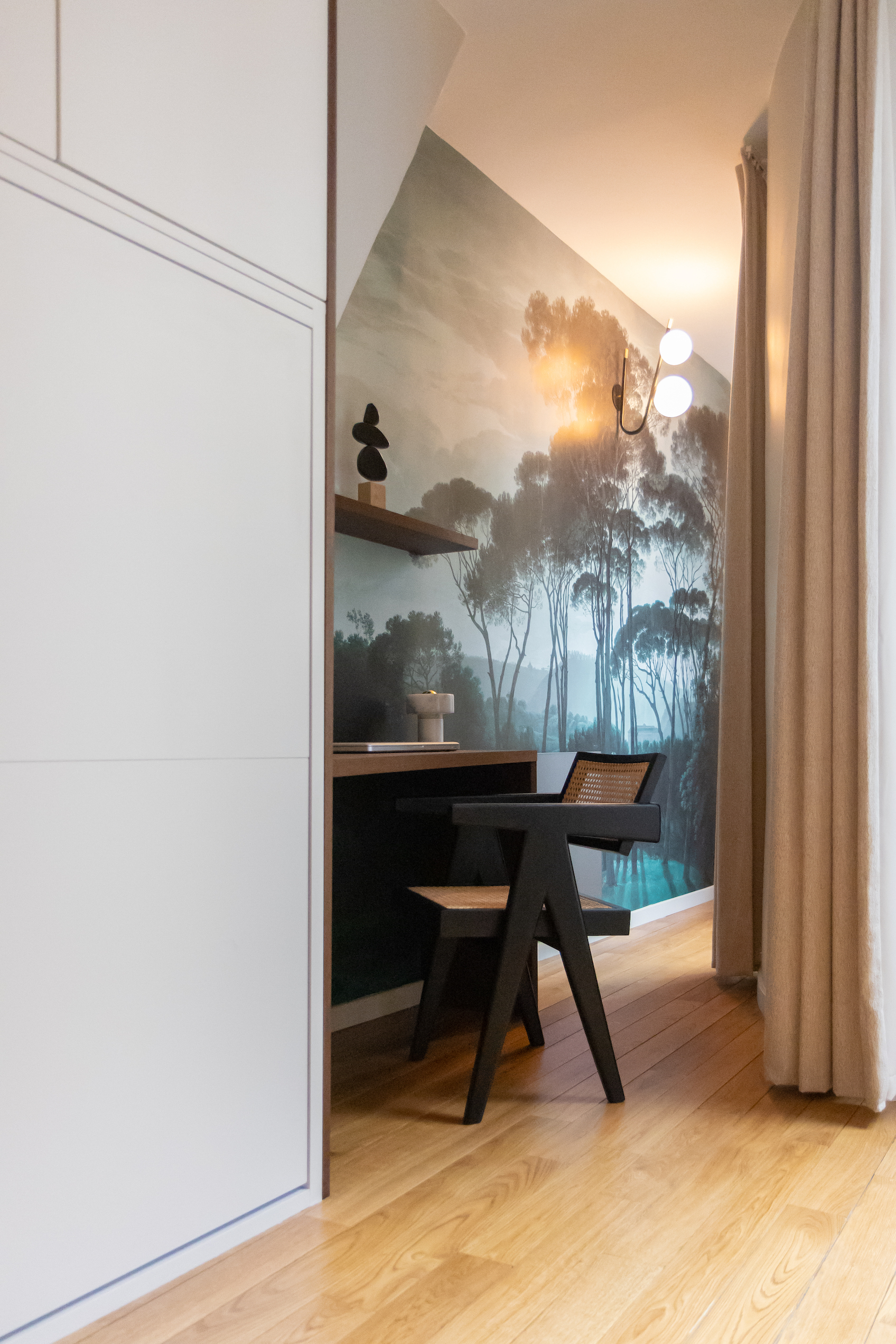 Des menuiseries réalisées sur mesure accueillent en toute discrétion un lit escamotable, tandis que l’on profite d’un bureau avec vue, grâce à un papier peint panoramique se prolongeant jusqu’à la chambre.