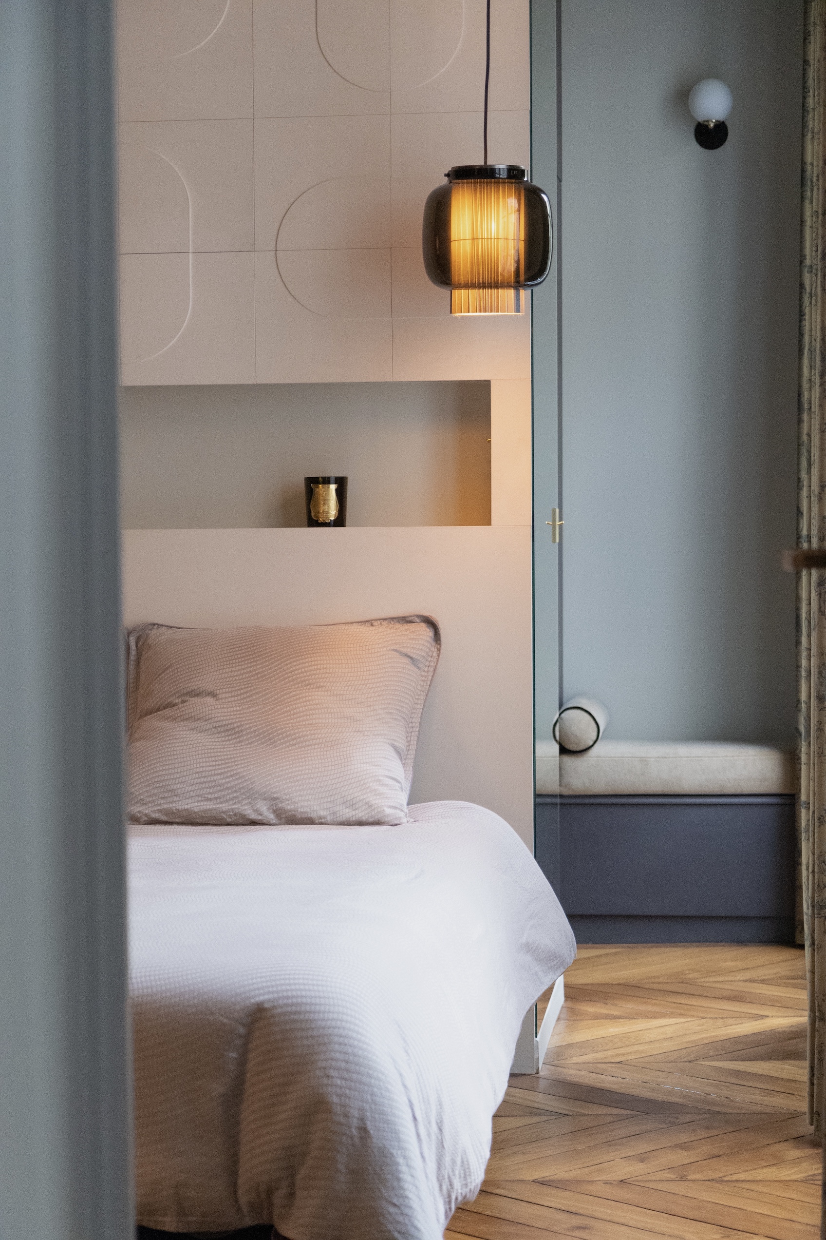 Afin de maximiser le rangement le long des murs, le lit a été positionné de manière centrale. Il repose contre une tête de lit particulièrement couture, avec ses panneaux graphiques en simili cuir.