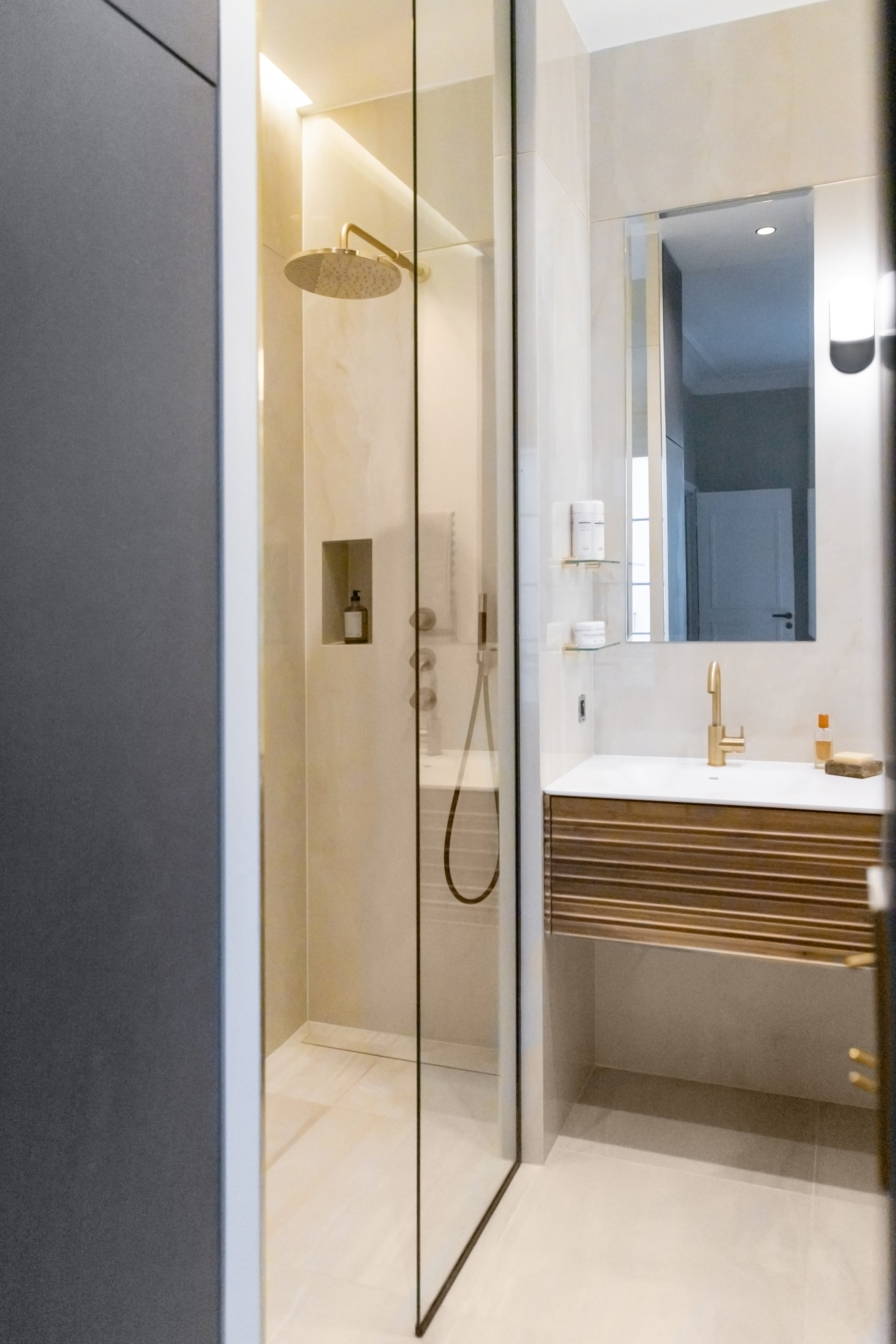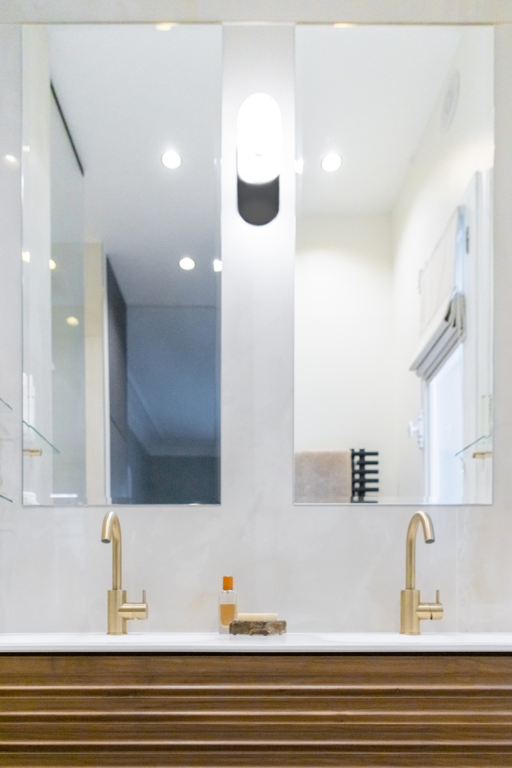 Réalisée entièrement sur-mesure à partir de matériaux précieux tels que la pierre, le verre et le laiton brossé, la salle d’eau a tout d’un hôtel de luxe !