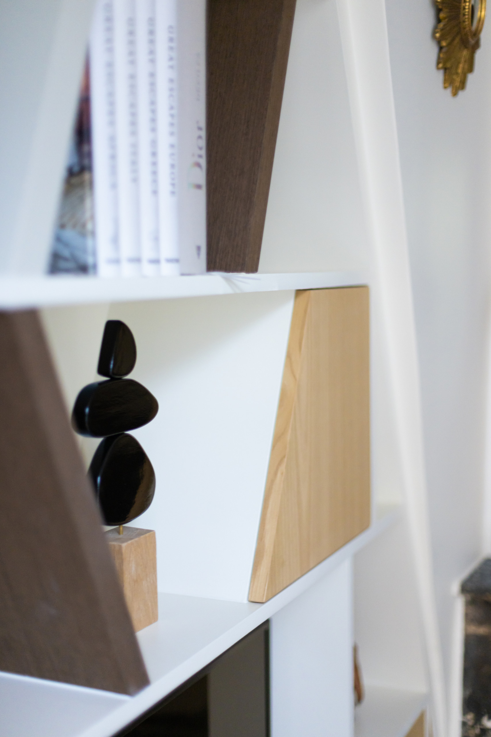 La bibliothèque contourne les contraintes de la cheminée et de son conduit pour s’intégrer naturellement dans le décor en jouant sur les obliques.