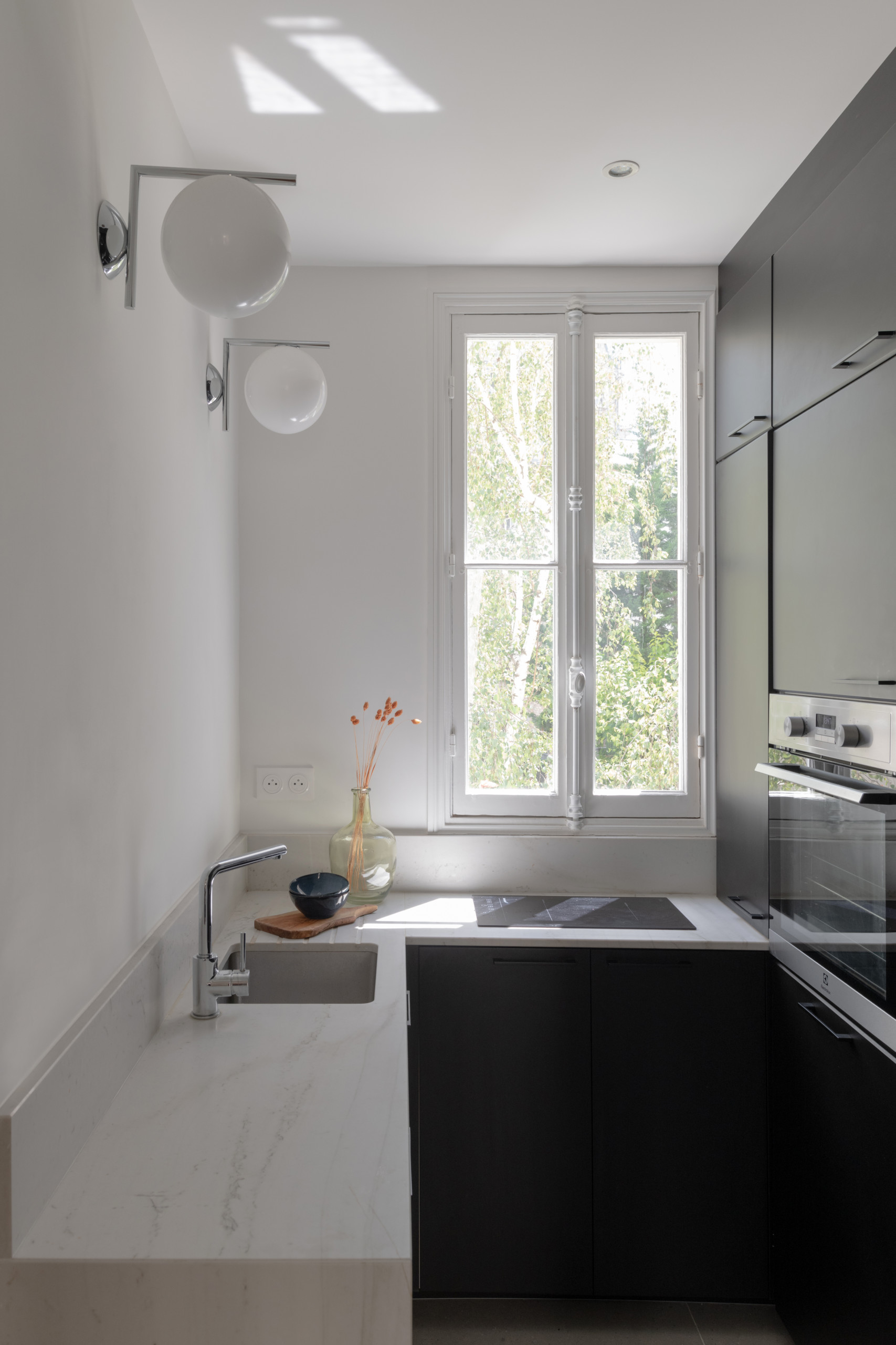 Face à lui, un plan de travail épuré en granit Mont Blanc. Deux élégantes appliques ont été placées en hauteur pour un mur visuellement dégagé, important dans un petit espace.