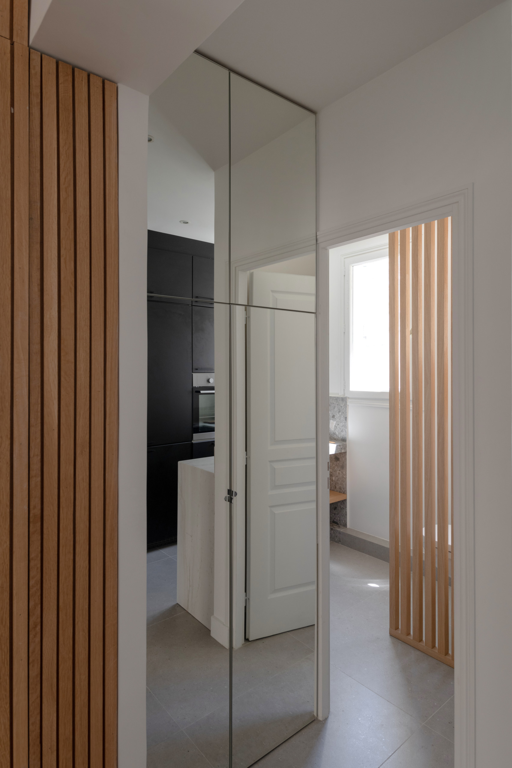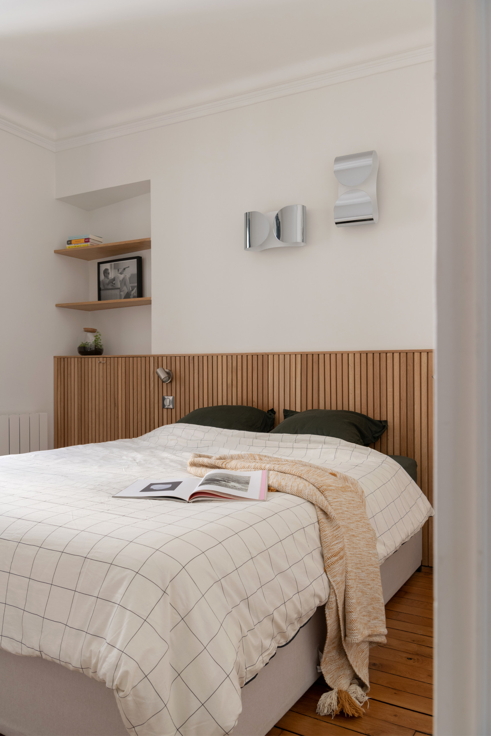Les tasseaux en chêne verticaux ont donné un rythme et une perspective aux différentes pièces. Un écho se joue entre le placard de l’entrée et la tête de lit de la chambre.