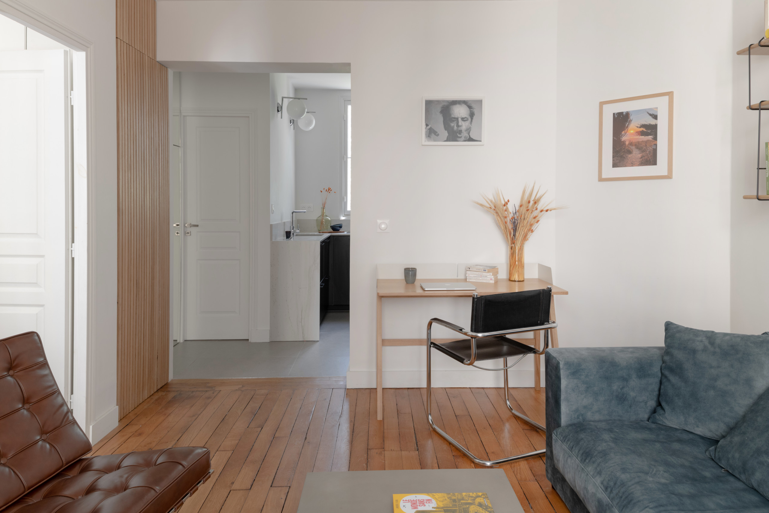 La cuisine a été ouverte au maximum sur le séjour, malgré la contrainte d’un mur porteur. La lumière devient ainsi traversante.