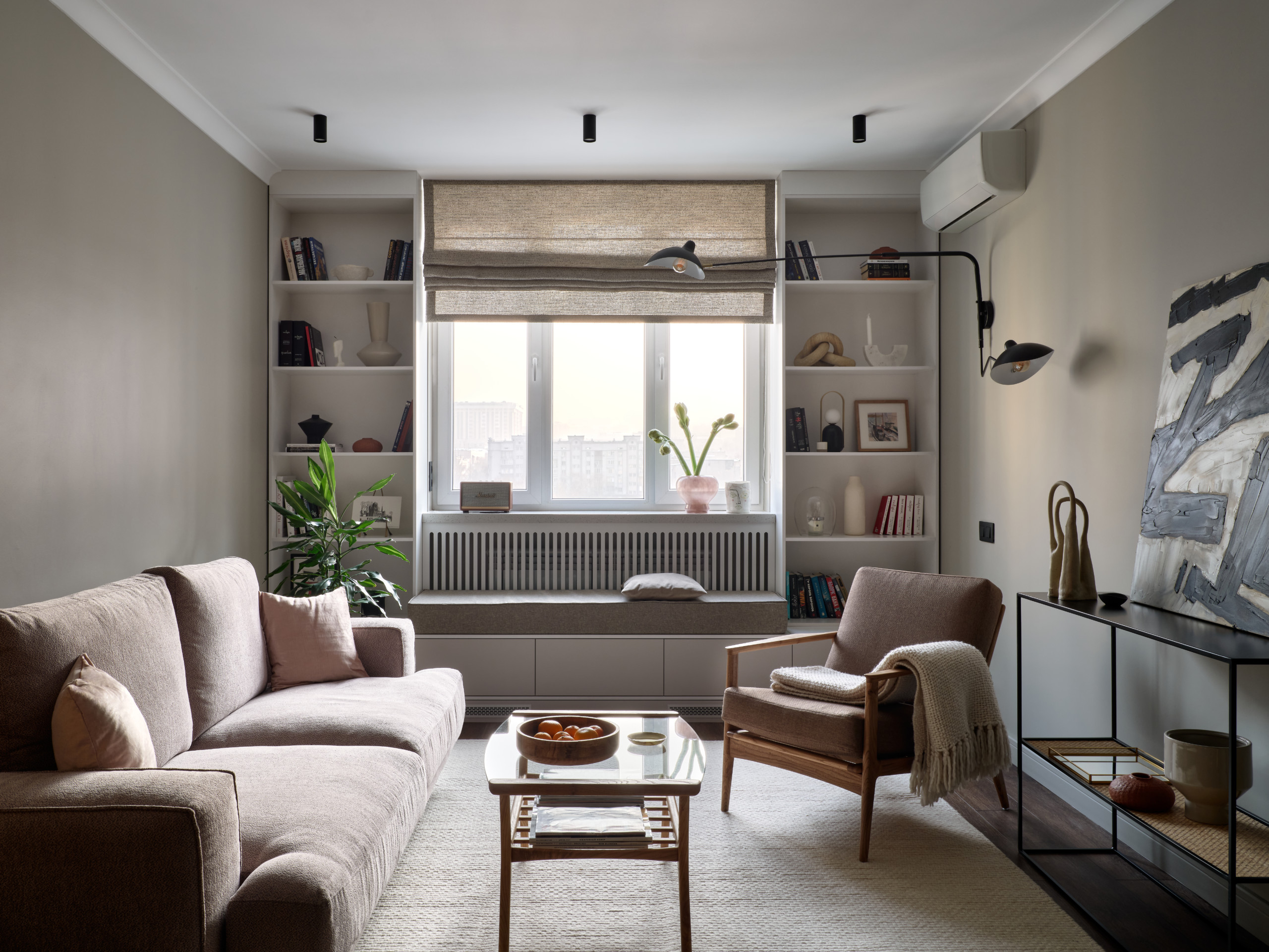 Le plateau transparent de la table basse sur mesure permet de ne pas encombrer la perspective dans ce salon compact.
