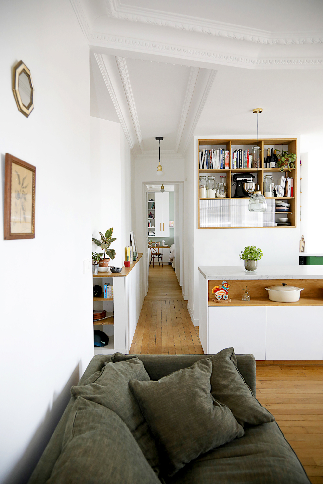 Bibliothèque Bois Cuisine ouverte Dressing Ilot central Marbre Mosaïque Moulure Mur coloré Plantes Verre flûte Verrière Zellige