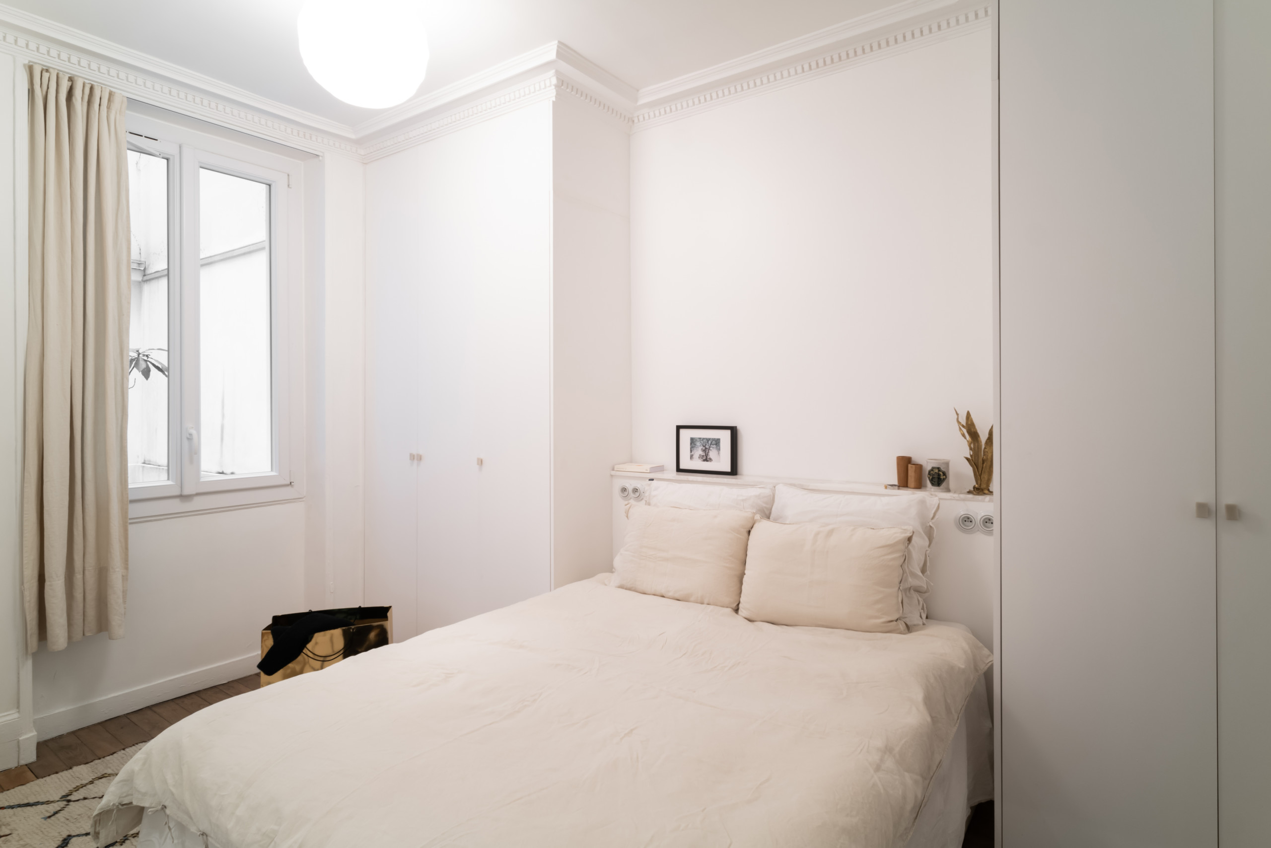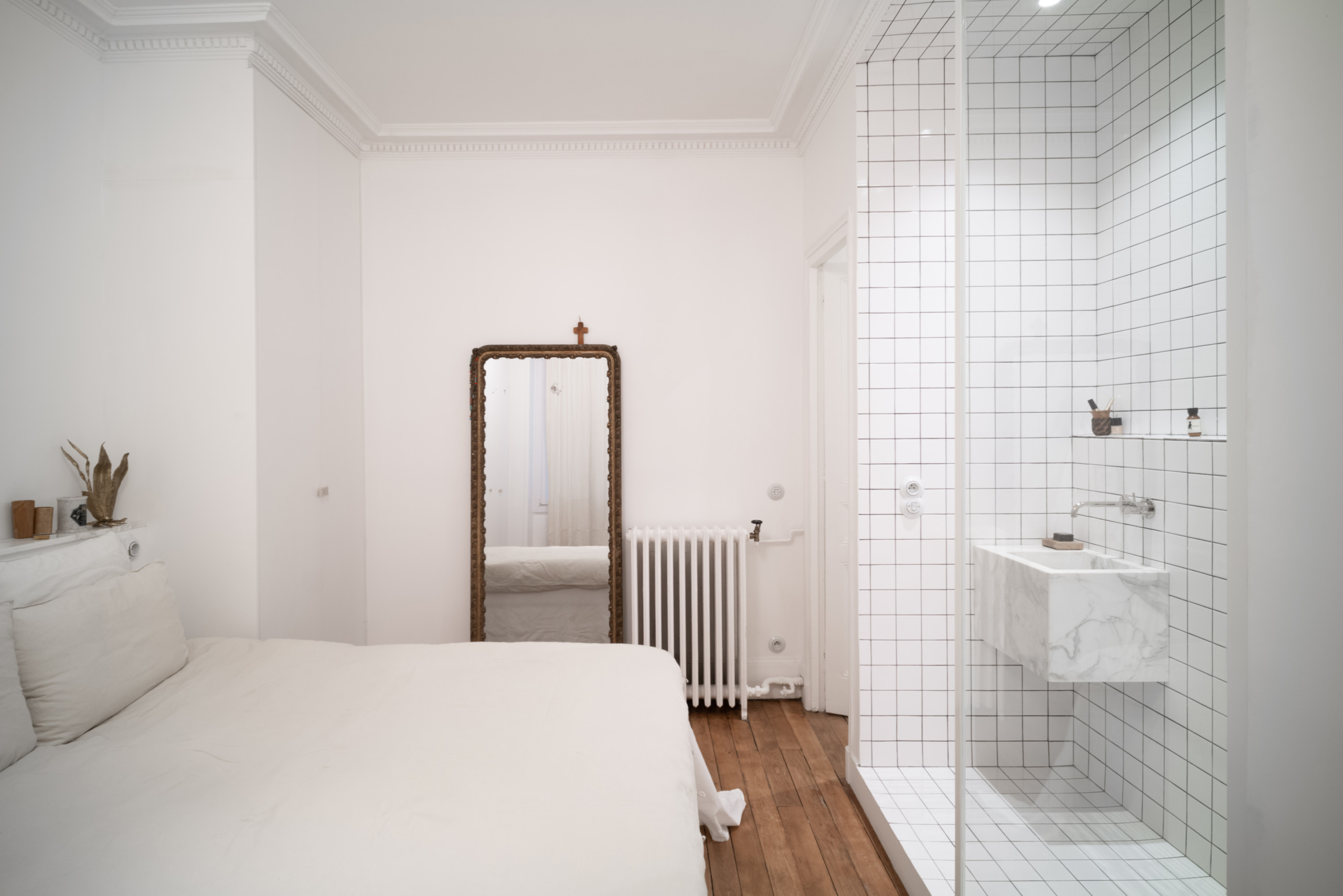 A l’image du reste de l’appartement, la chambre se veut minimaliste, tant dans son ameublement que sa décoration. Les moulures du plafond ont été reproduites sur les dressings, qui se fondent ainsi dans le décor.