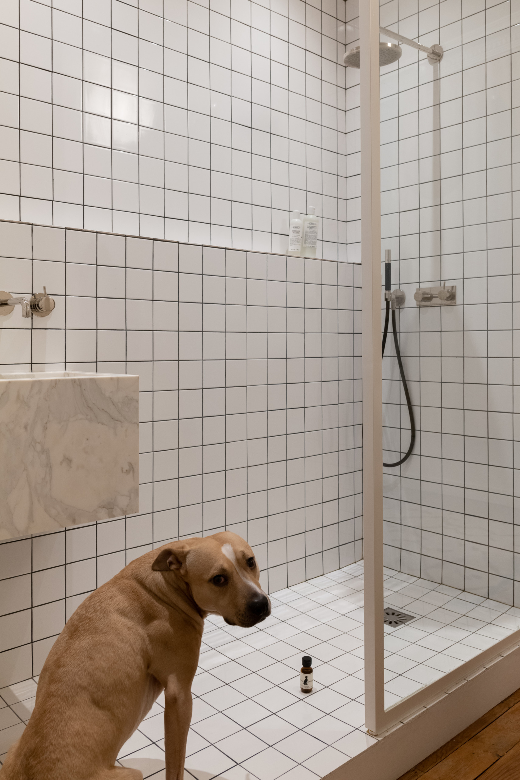Sa robinetterie encastrée et sa vasque en marbre calacatta fabriquée sur mesure en feraient baver plus d’un !