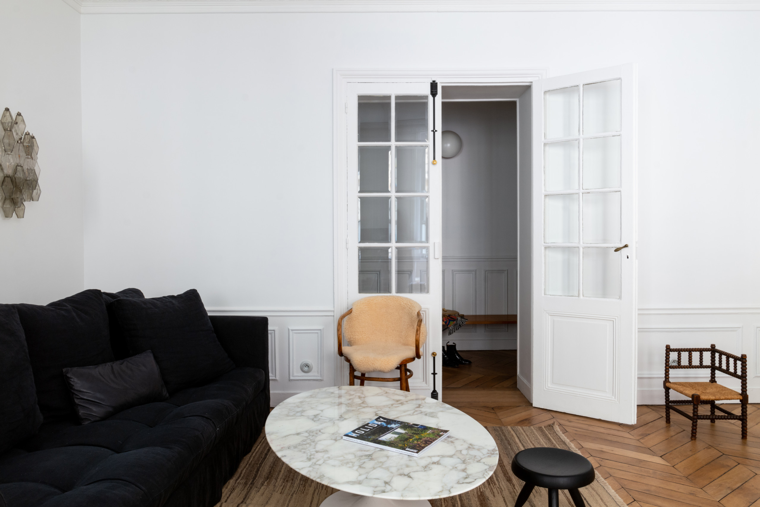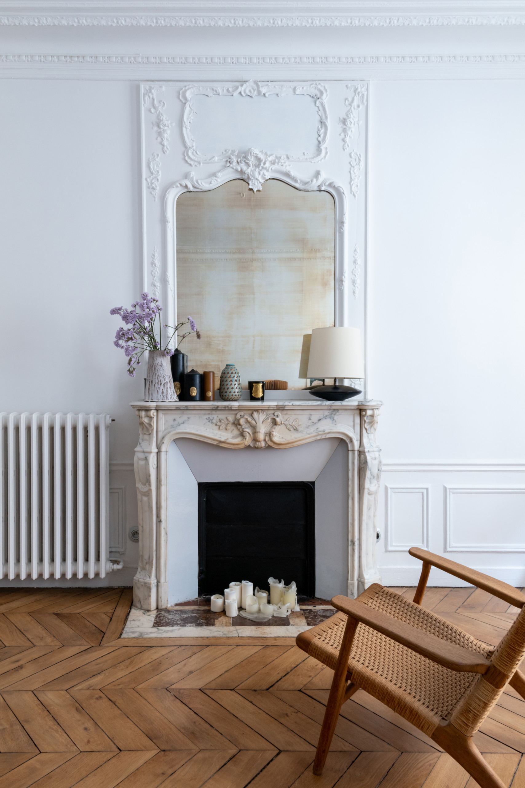 L’ameublement épuré met en valeur les caractéristiques haussmanniennes de l’appartement: parquet massif, moulures, et bien sûr cheminée en marbre !