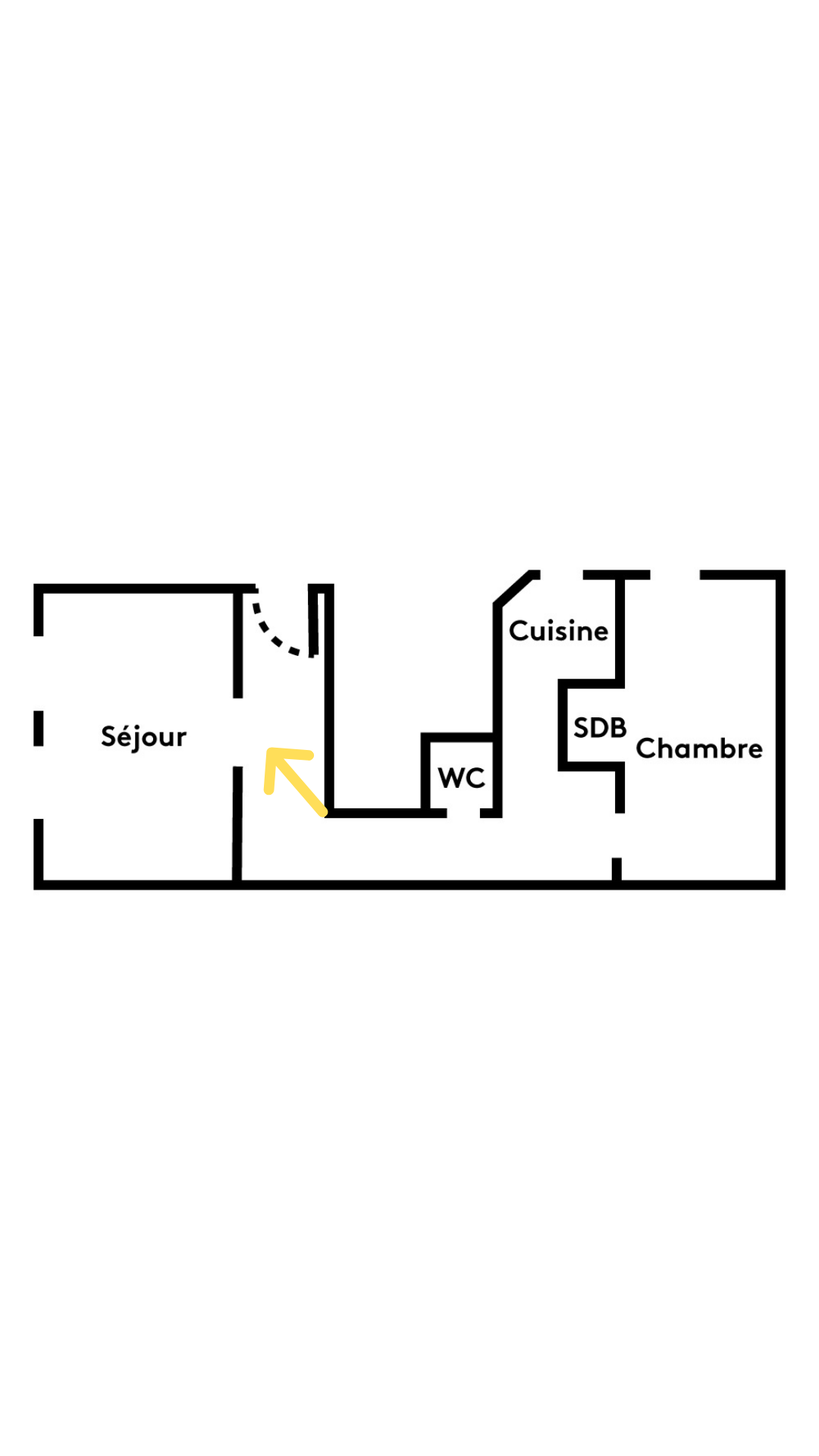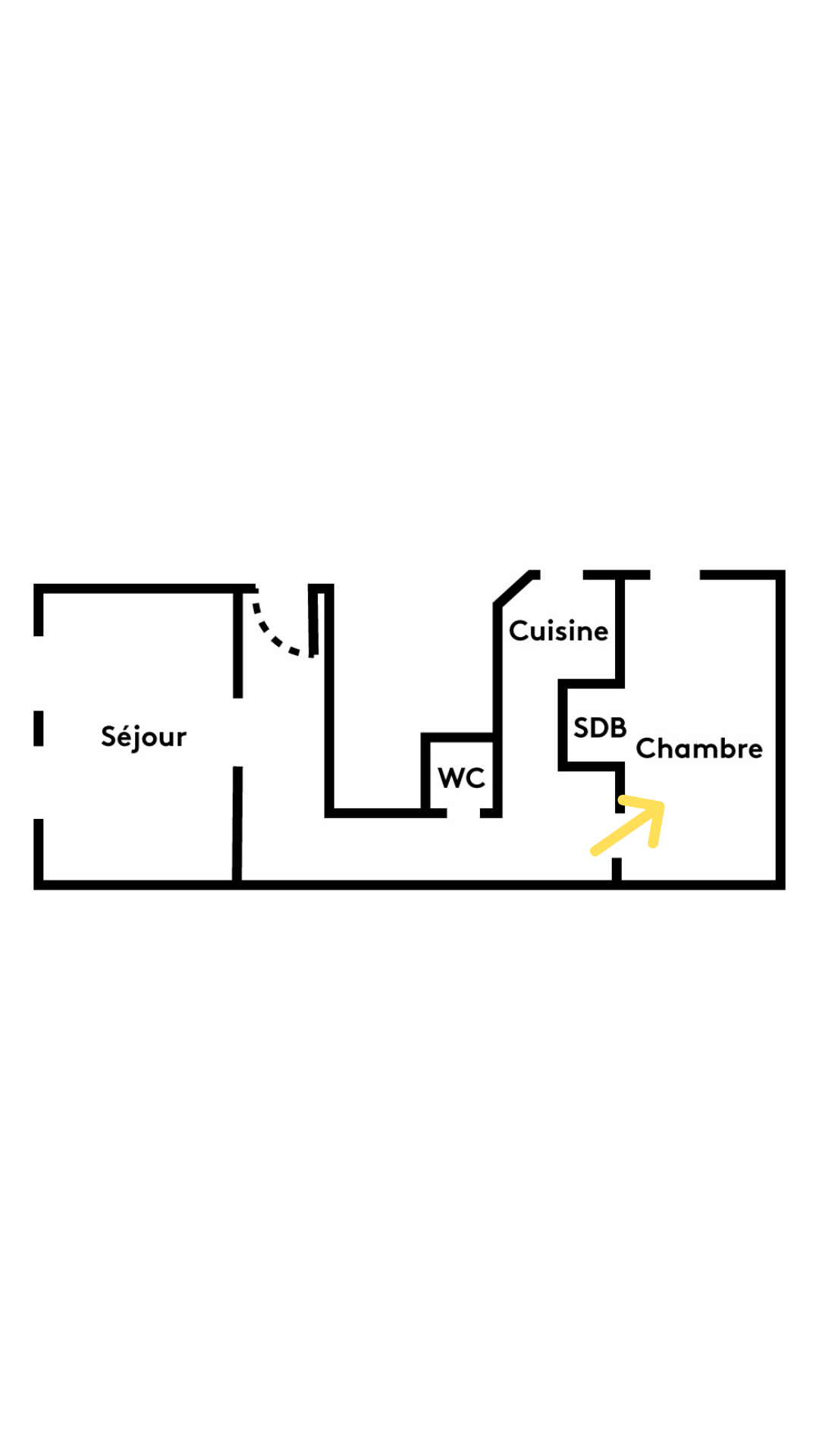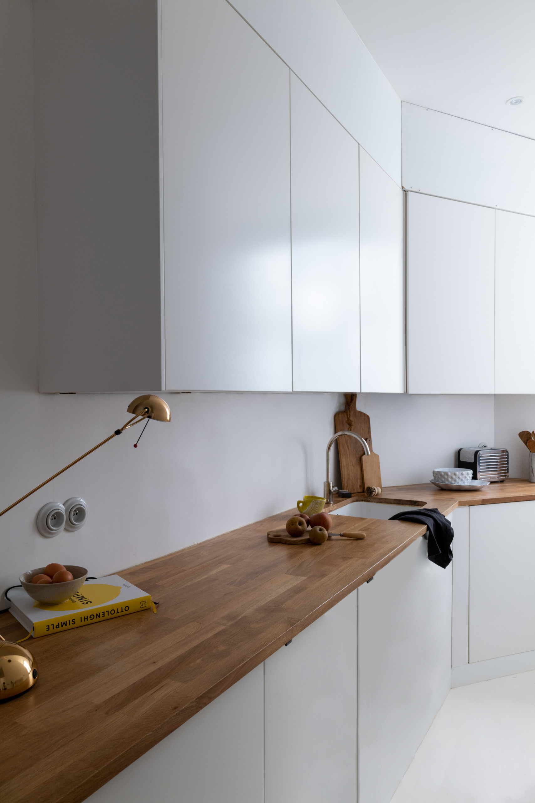 Direction la cuisine ! Ses dimensions ont été réduites afin de créer une salle d’eau côté chambre qui n’empiète pas sur le volume de cette dernière.
