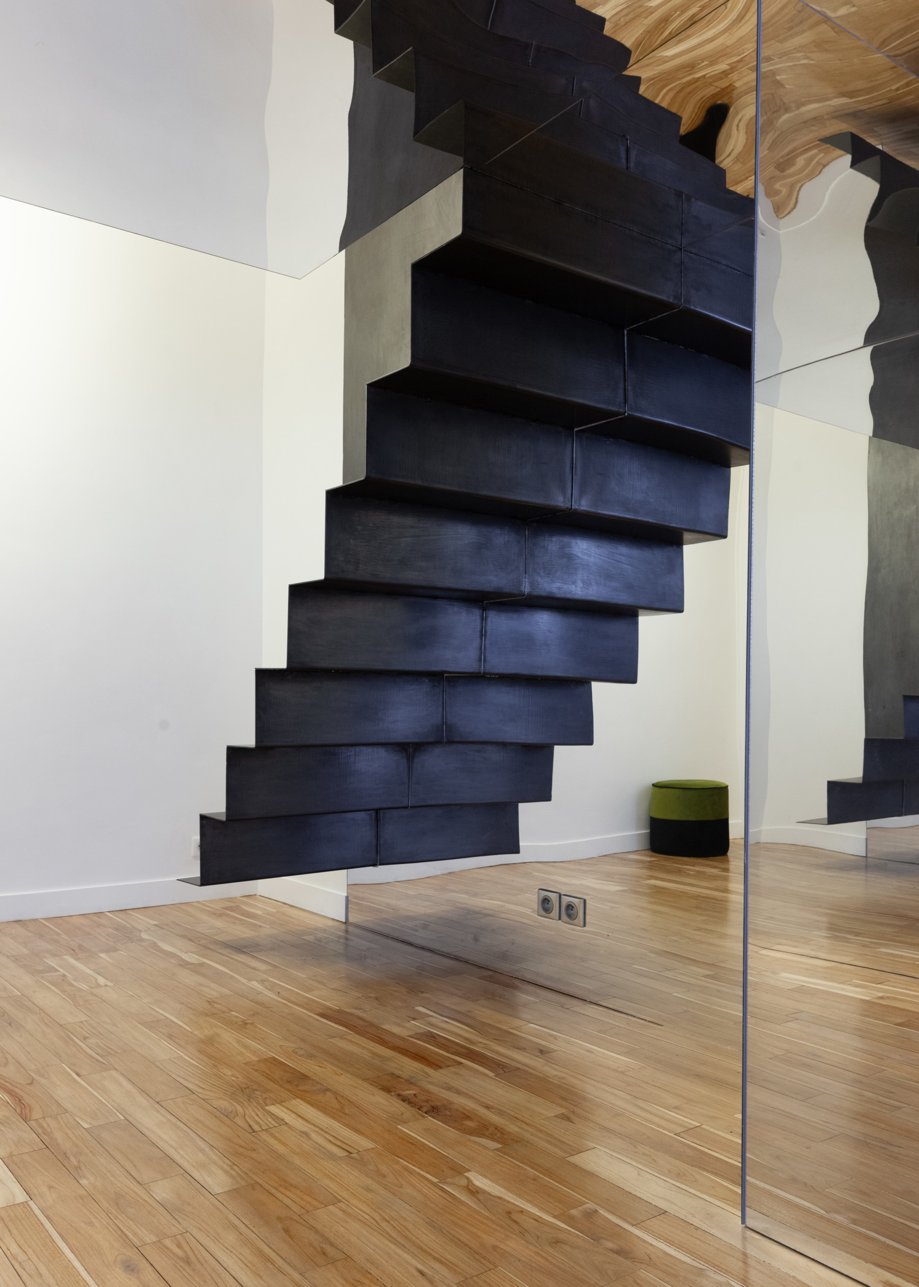 … métal qu’on retrouve en version brossée et vernis mat pour cet escalier sur mesure, véritable œuvre d’art en lévitation.
