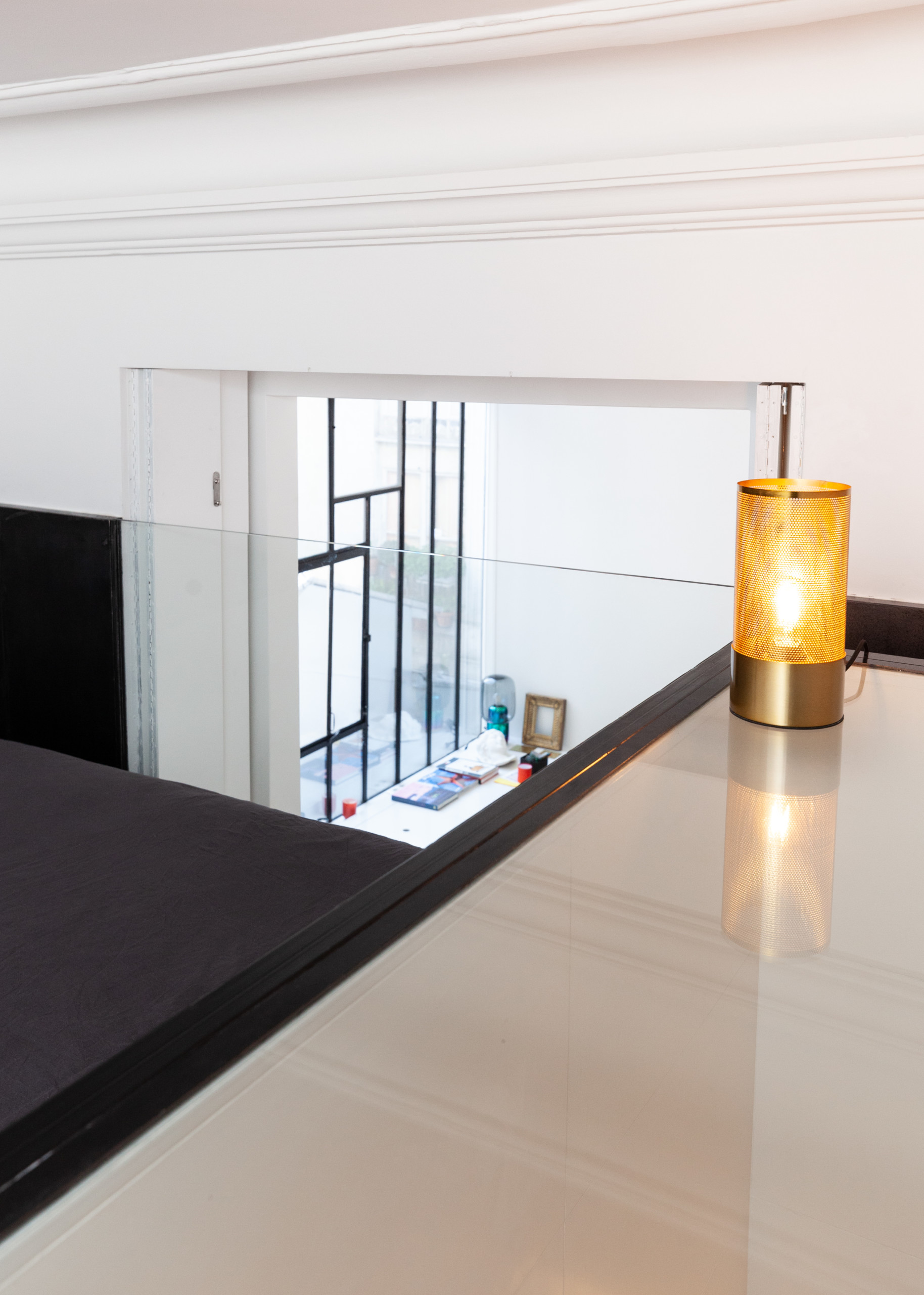 Vue sur le second espace du studio, à travers le garde-corps en verre trempé.
