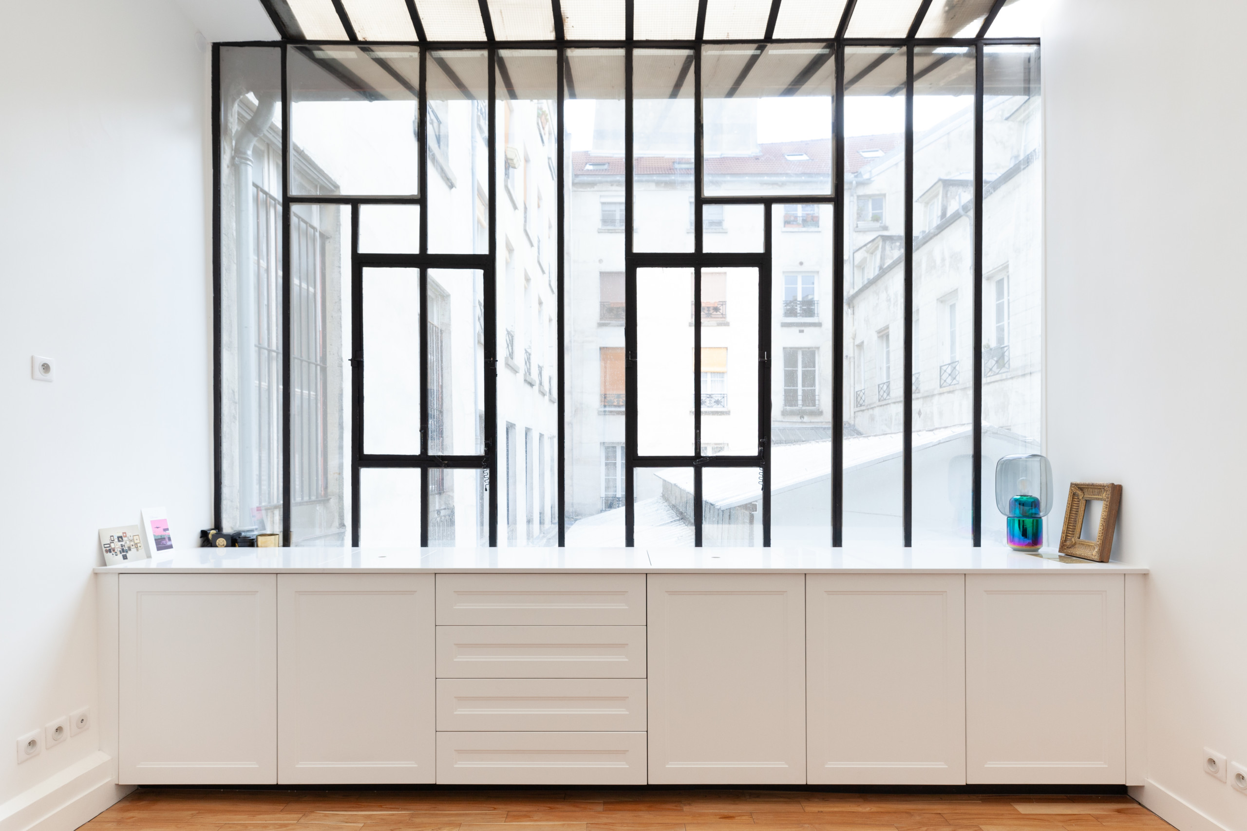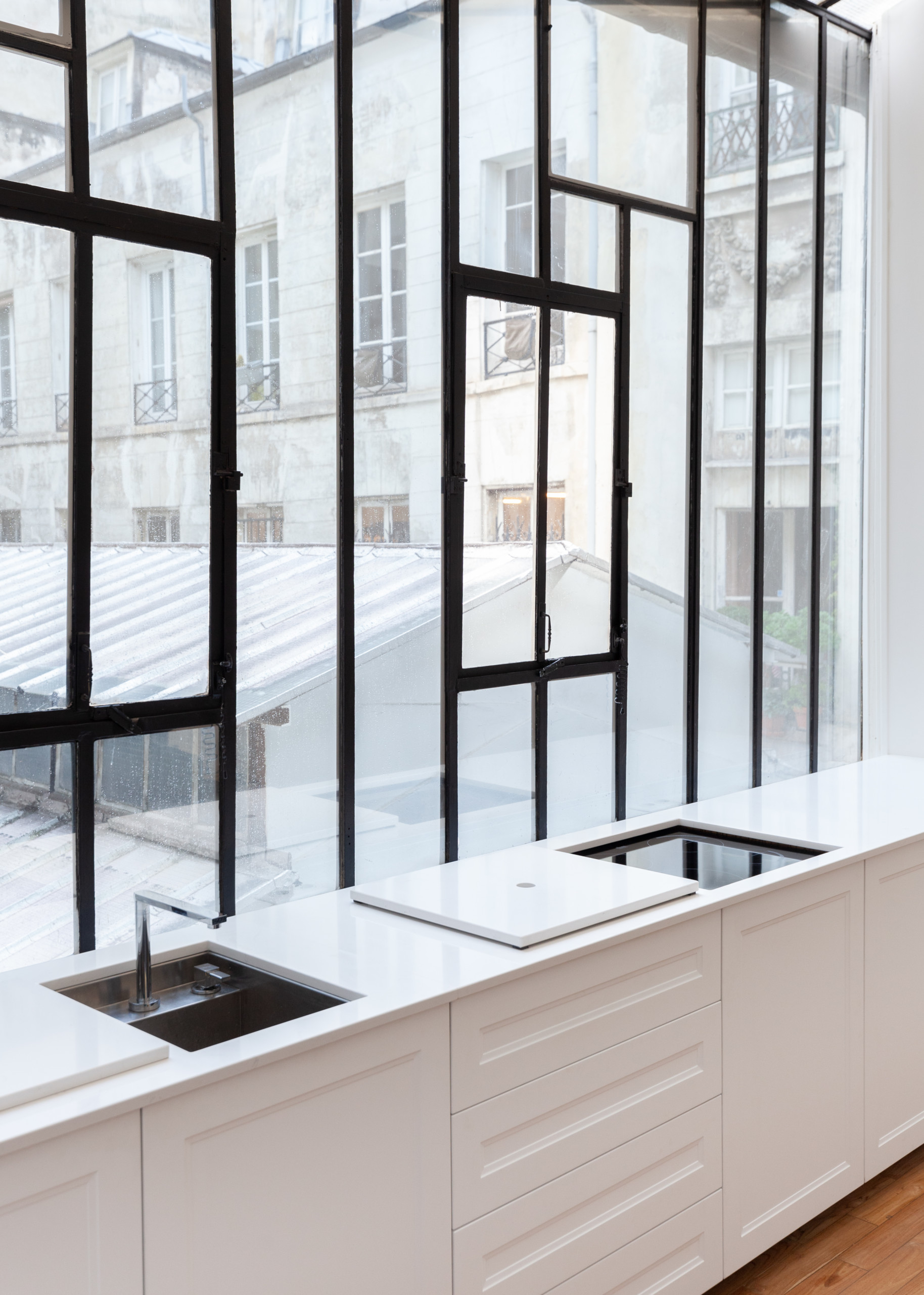 Avec la belle hauteur sous plafond, cette superbe verrière très graphique est la pièce maîtresse de cet espace…