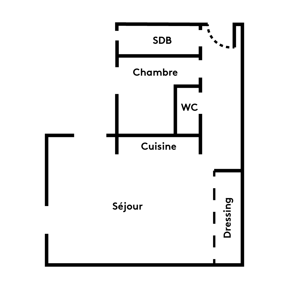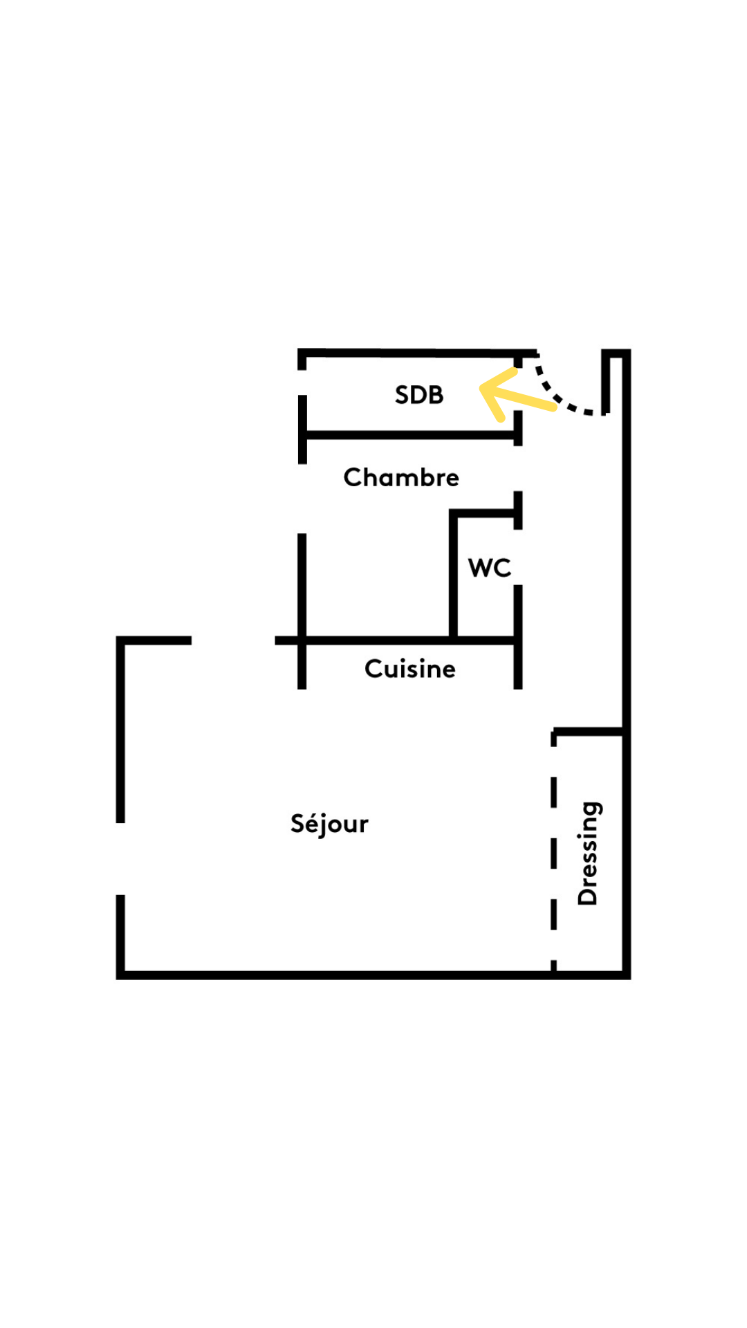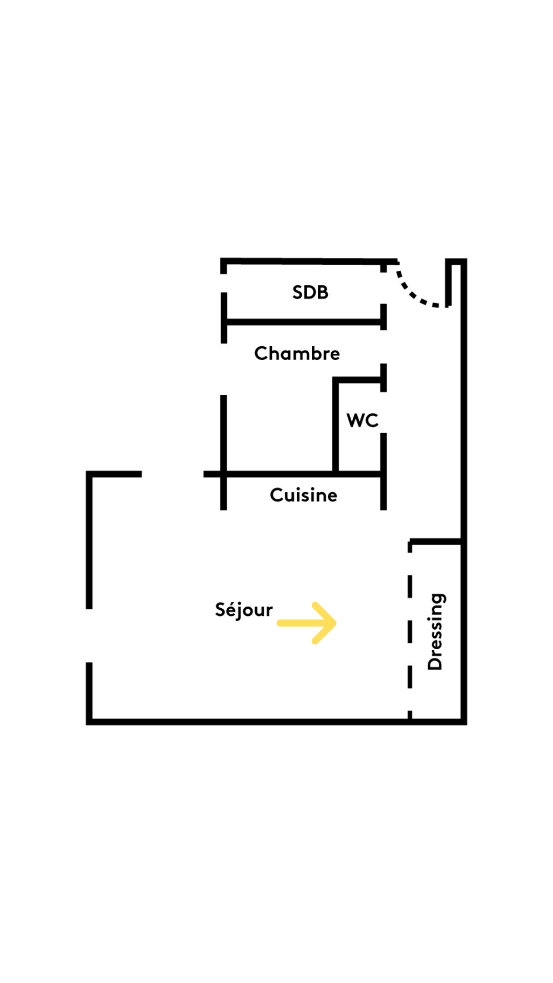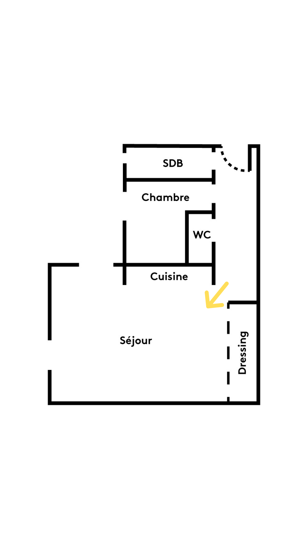 Nous entrons dans l’appartement par un long couloir blanc menant à la pièce à vivre.