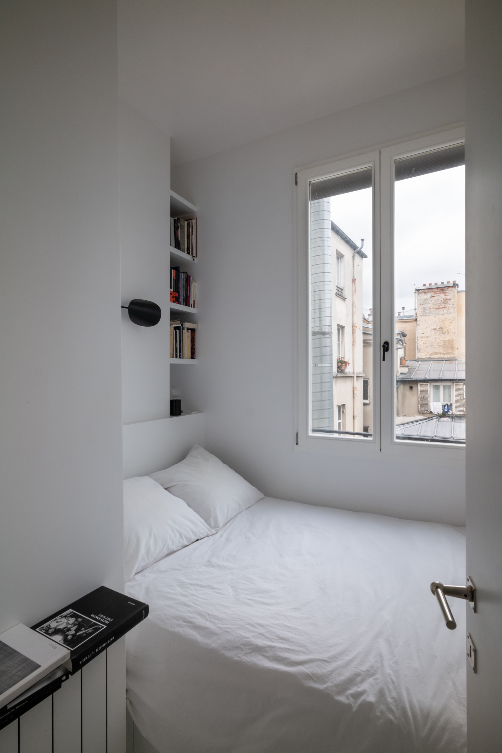 La seconde porte s’ouvre sur la chambre lumineuse. Le lit, glissé sous la fenêtre, est l’unique meuble installé dans la pièce. Il dispose d’une belle vue sur les toits de Paris !