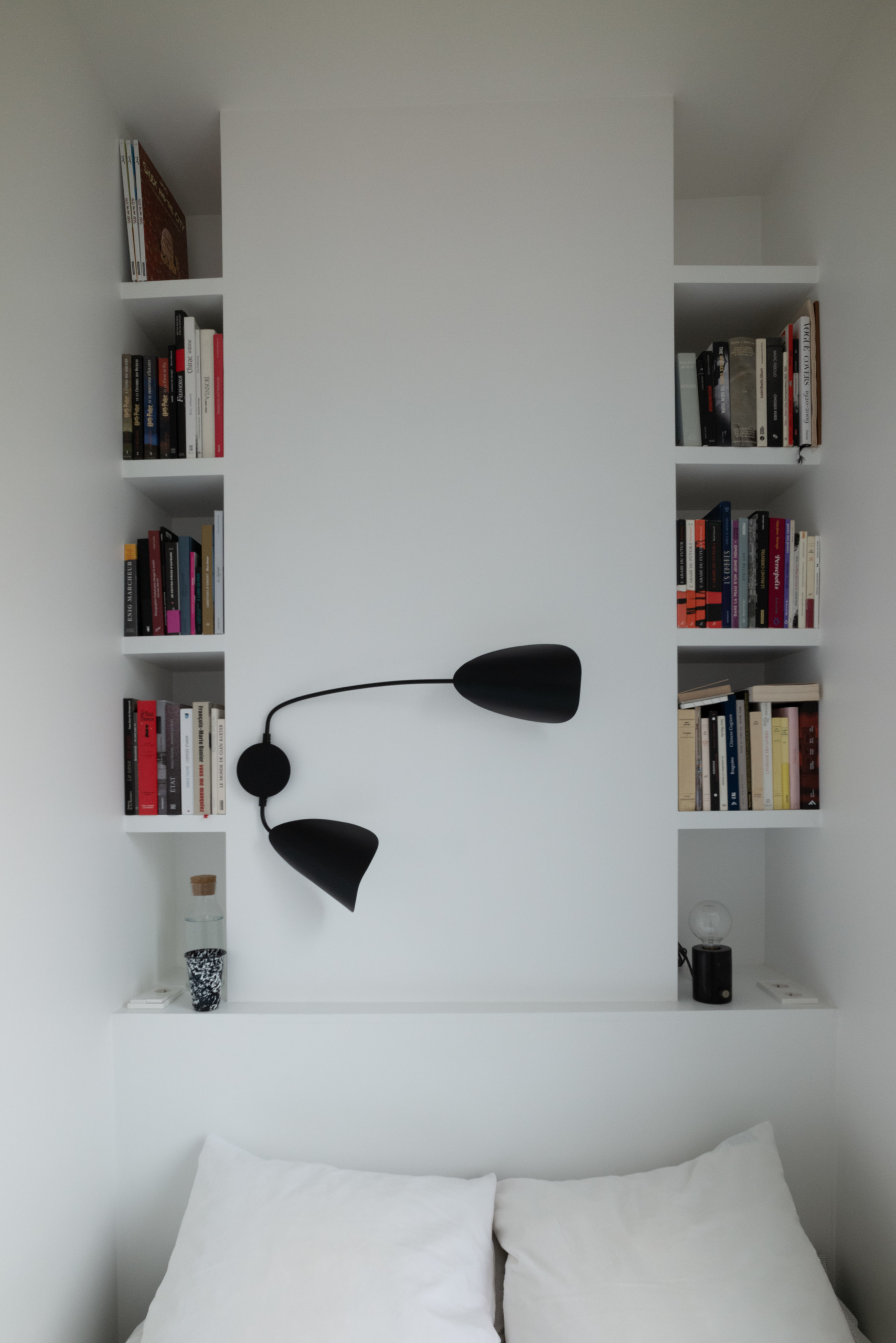 On a créé une tête de lit sur-mesure qui comprend deux colonnes de cases pour disposer livres et lampes de chevet.