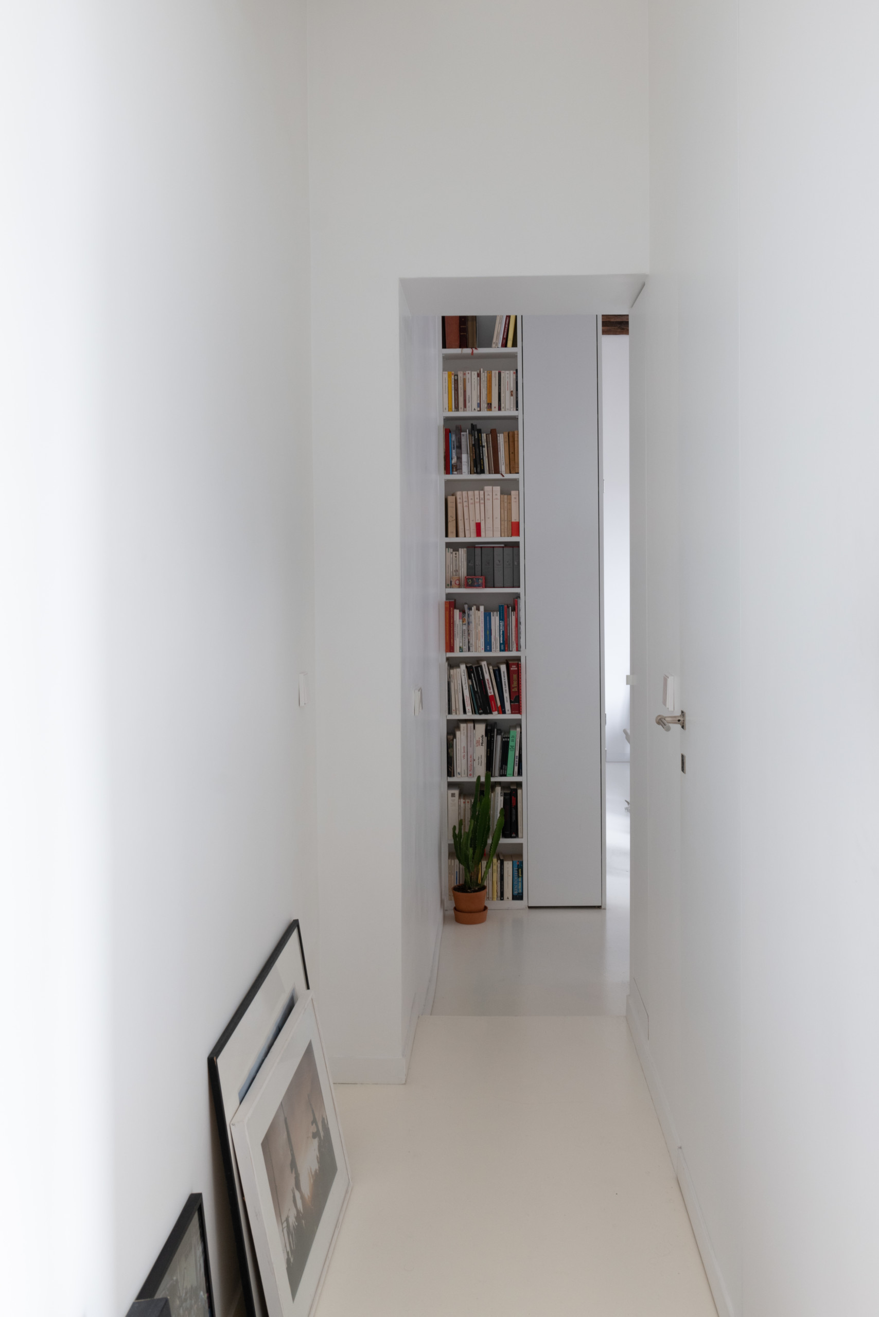 Direction la pièce à vivre ! Le bout du couloir est marqué par une bibliothèque fine, dans l’esprit des colonnes de la chambre.