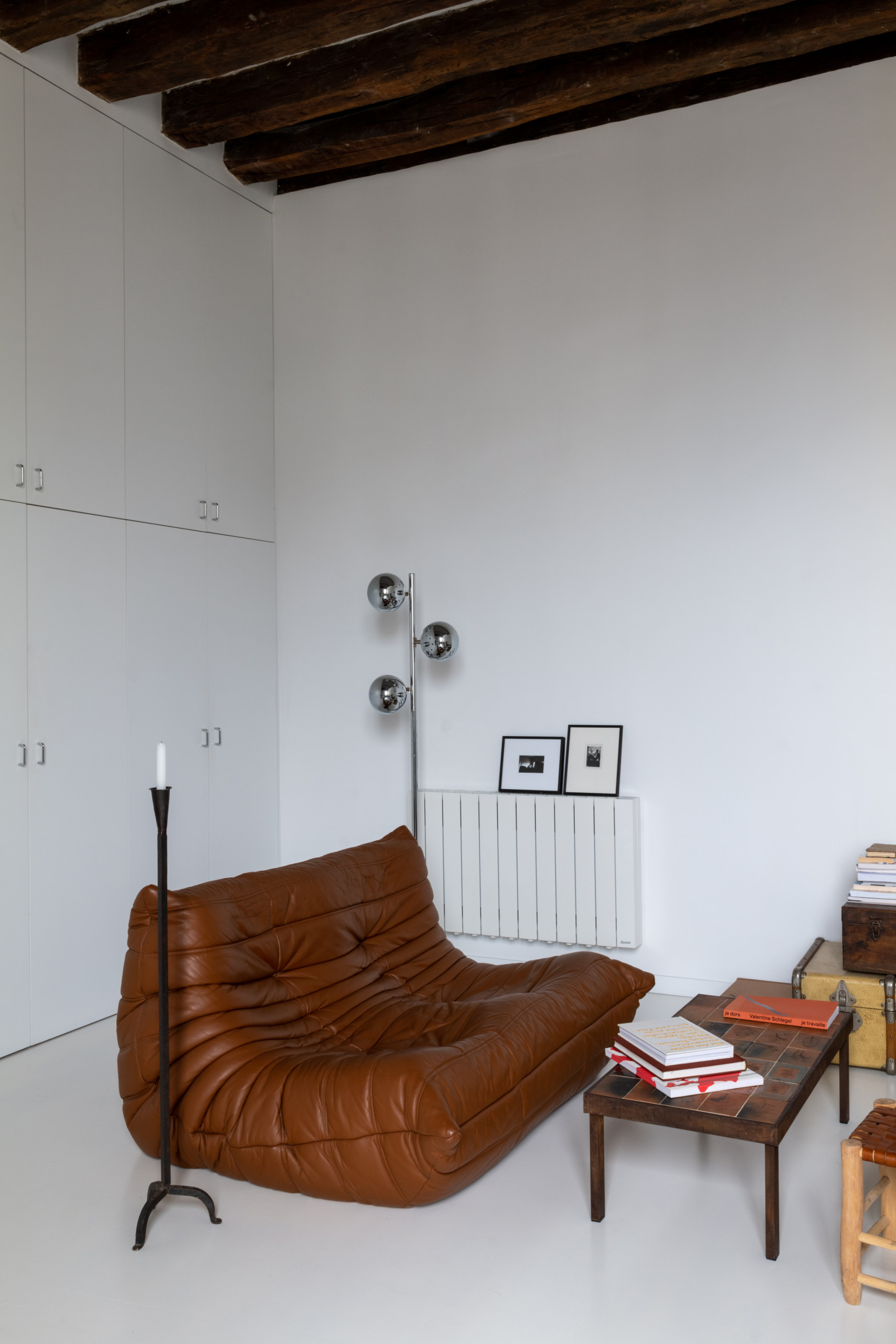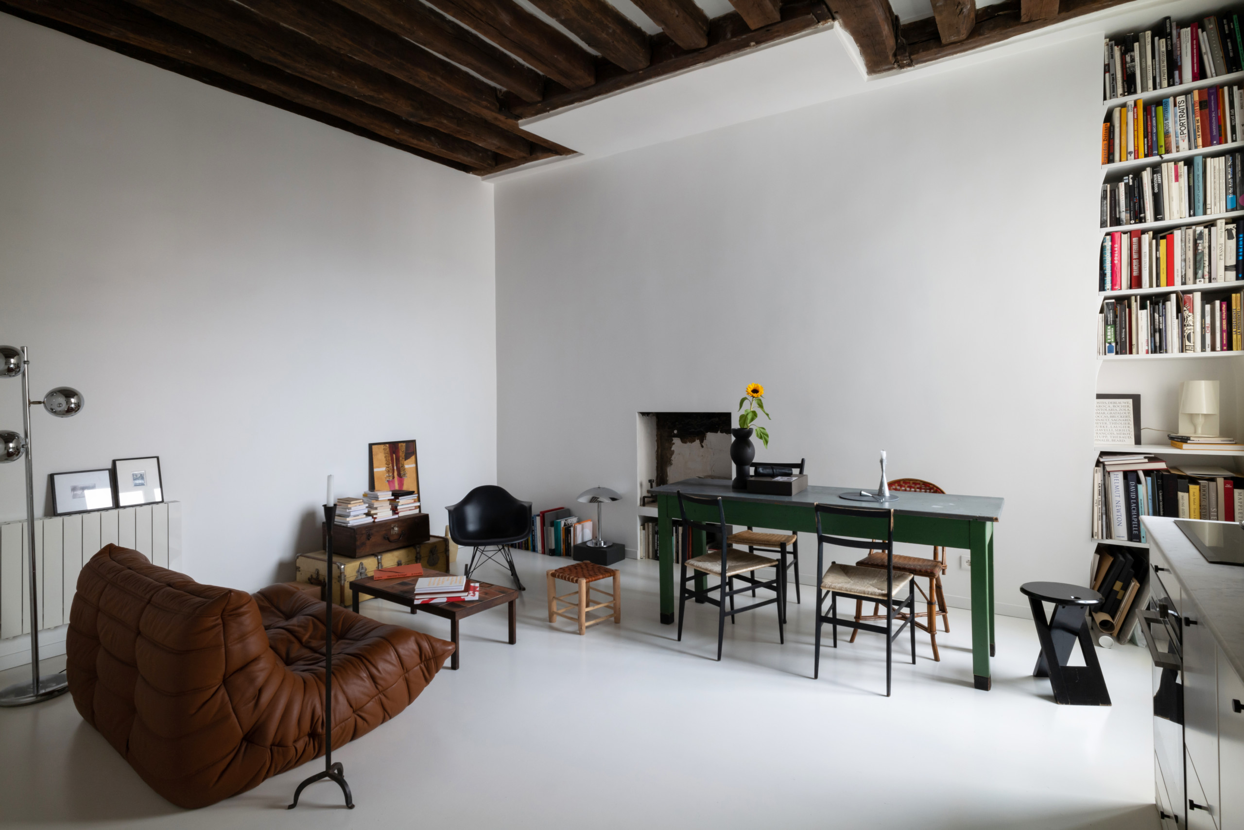 Le séjour reprend les codes de l’espace nuit avec des murs blancs, à un détail près : un majestueux plafond de poutres d’époque s’étend sur toute la surface de la pièce.