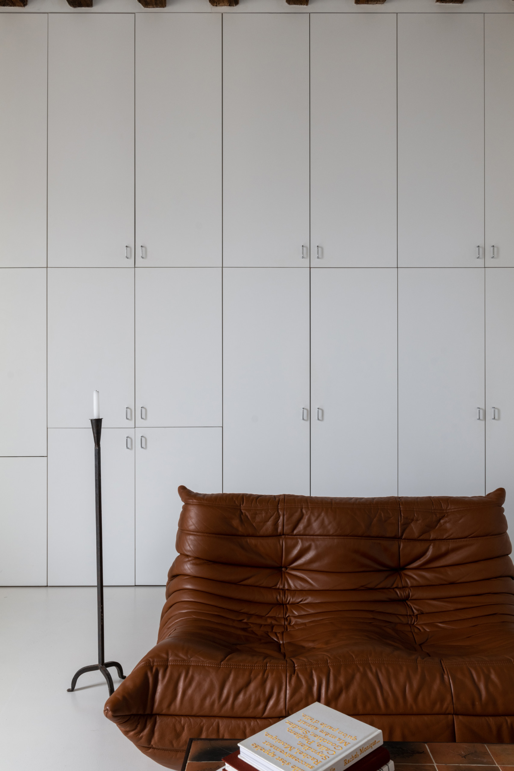 Derrière le canapé, un alignement de placards toute hauteur se déploie sur tout un pan de mur. Il accueille le frigo, le lave-linge et un dressing.