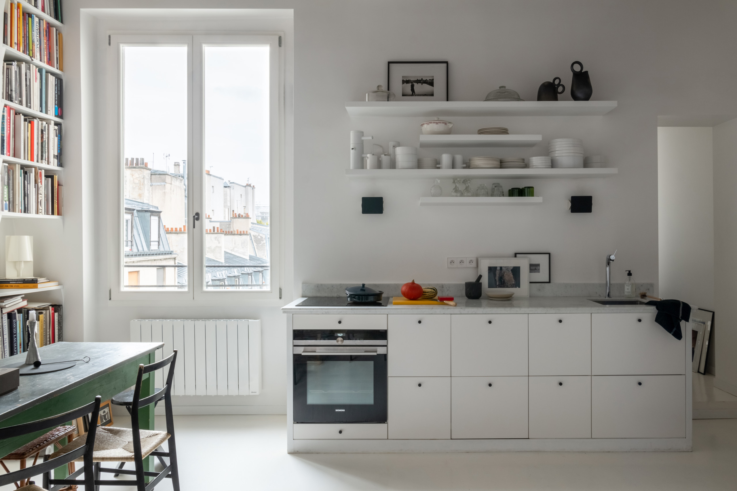 La cuisine est composée de caissons bas et blancs pour laisser la lumière circuler.