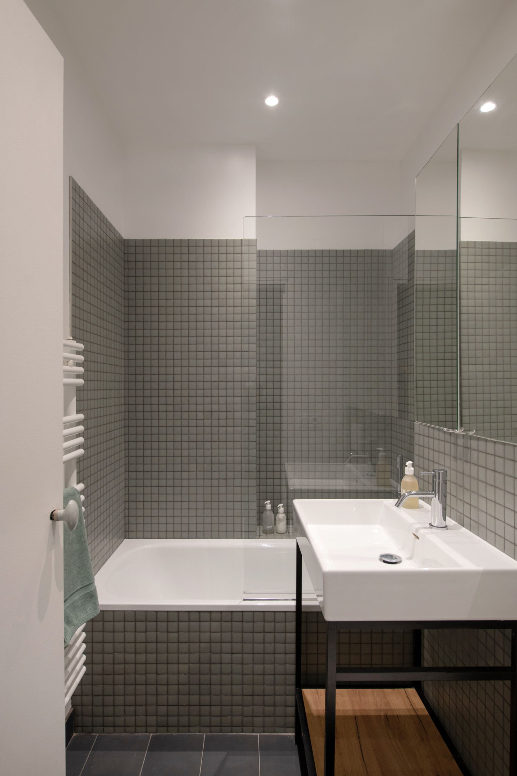 On aime le design minimaliste et graphique de la salle de bain. Ce carrelage 5×5 effet mosaïque est l’élément star !