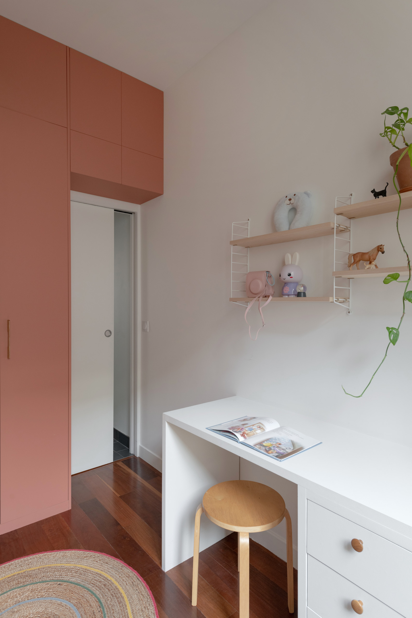 La visite se termine par la chambre des enfants, aux tons chauds. Tiens, encore une étagère String !