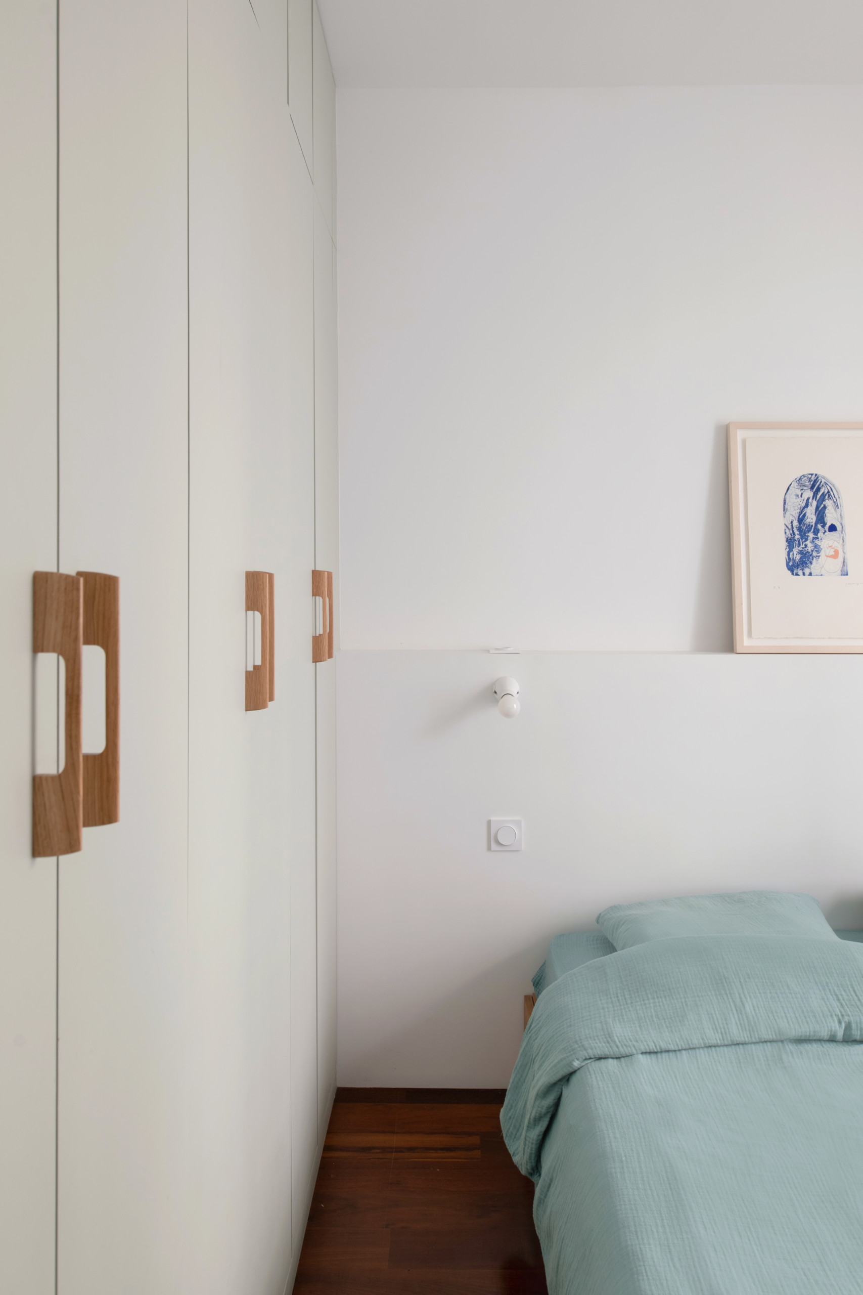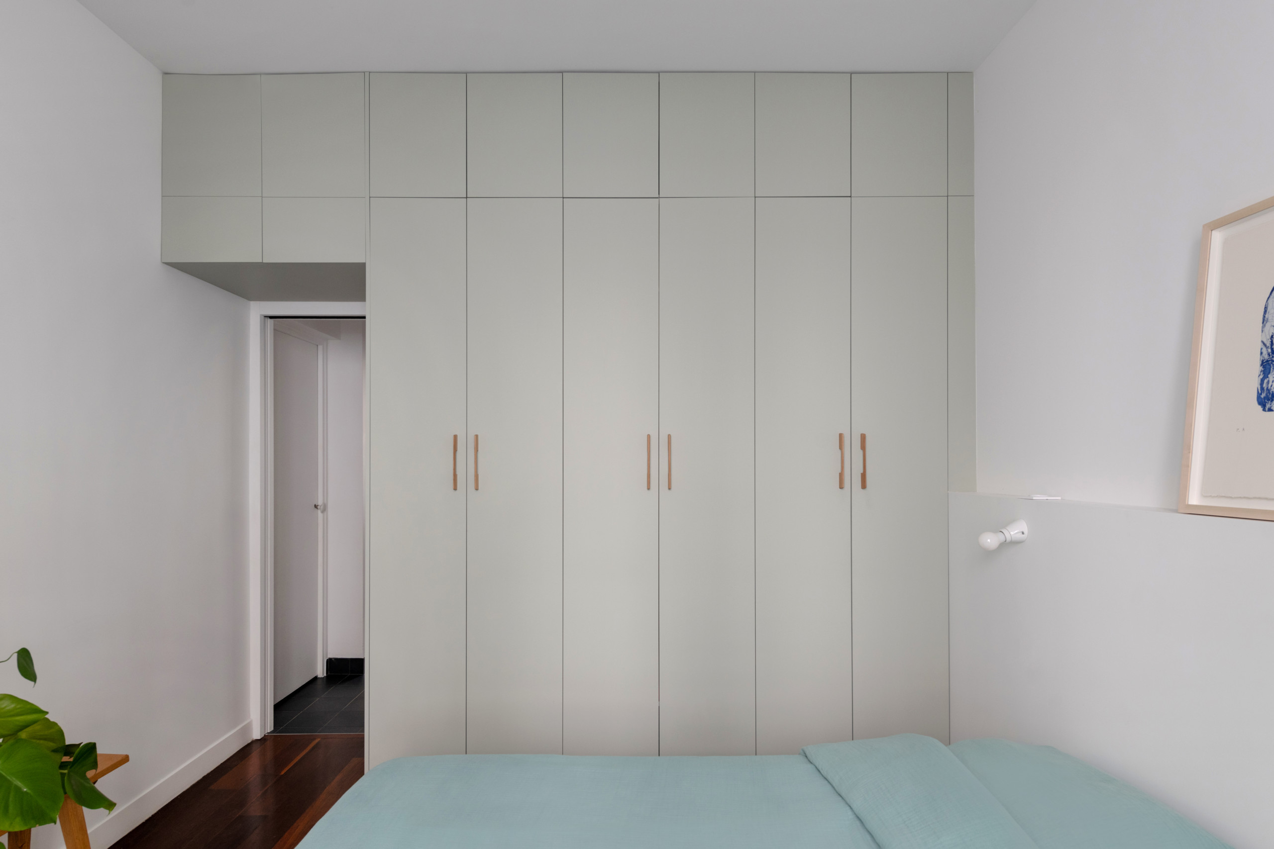 Quelle profondeur de dressing ! Portes en médium peintes dans un très subtil vert de gris et tête de lit maçonnée en ton sur ton avec le reste du mur.