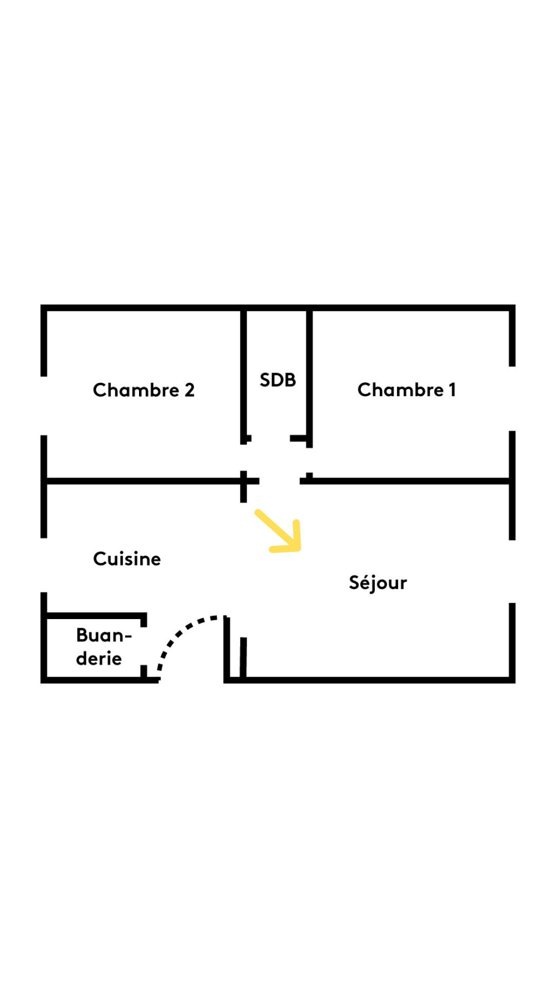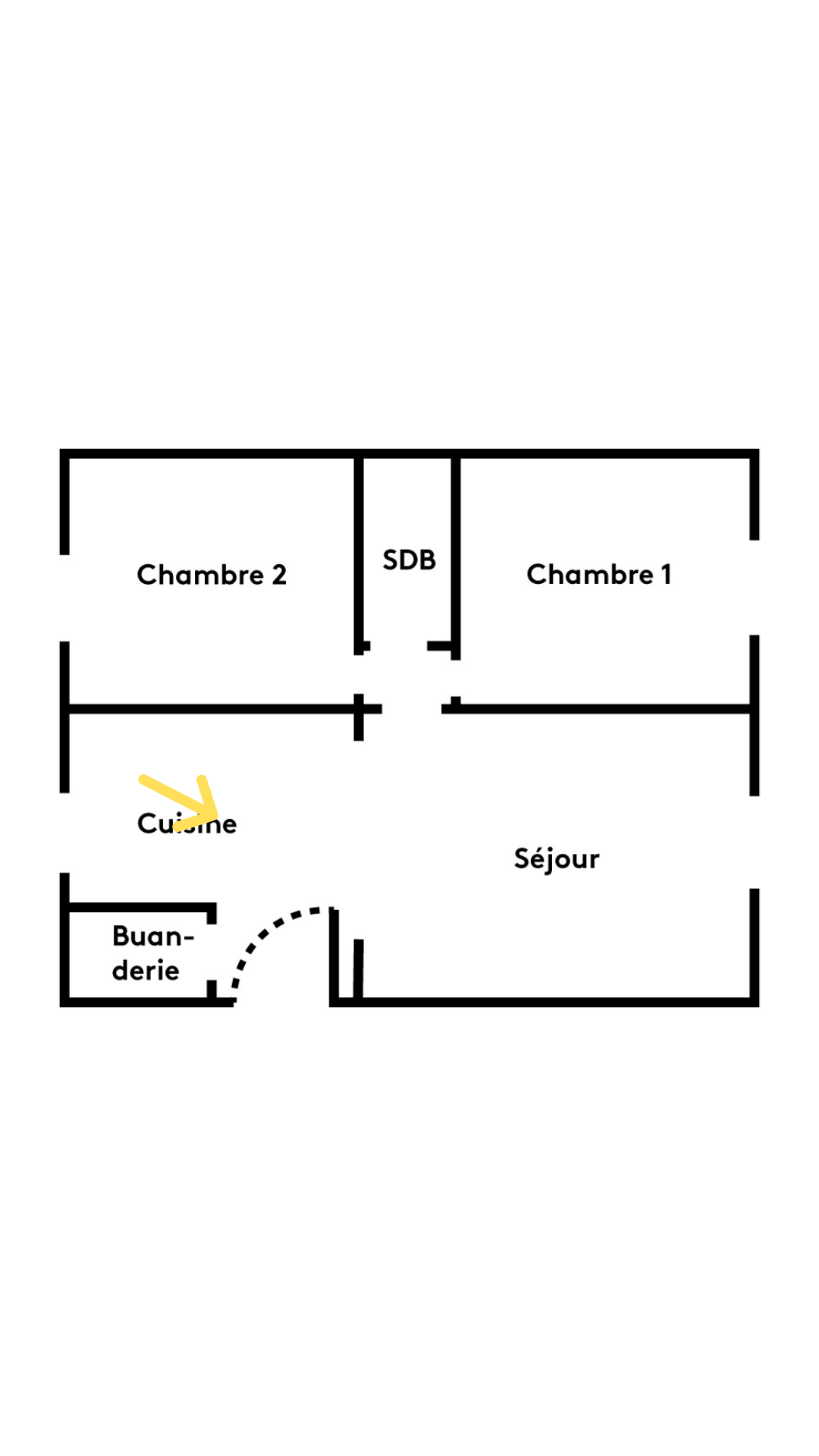 … avec un bar pour délimiter les espaces. Les tabourets jaunes assurent le show de la couleur. Au fond, un petit coin bureau intégré.